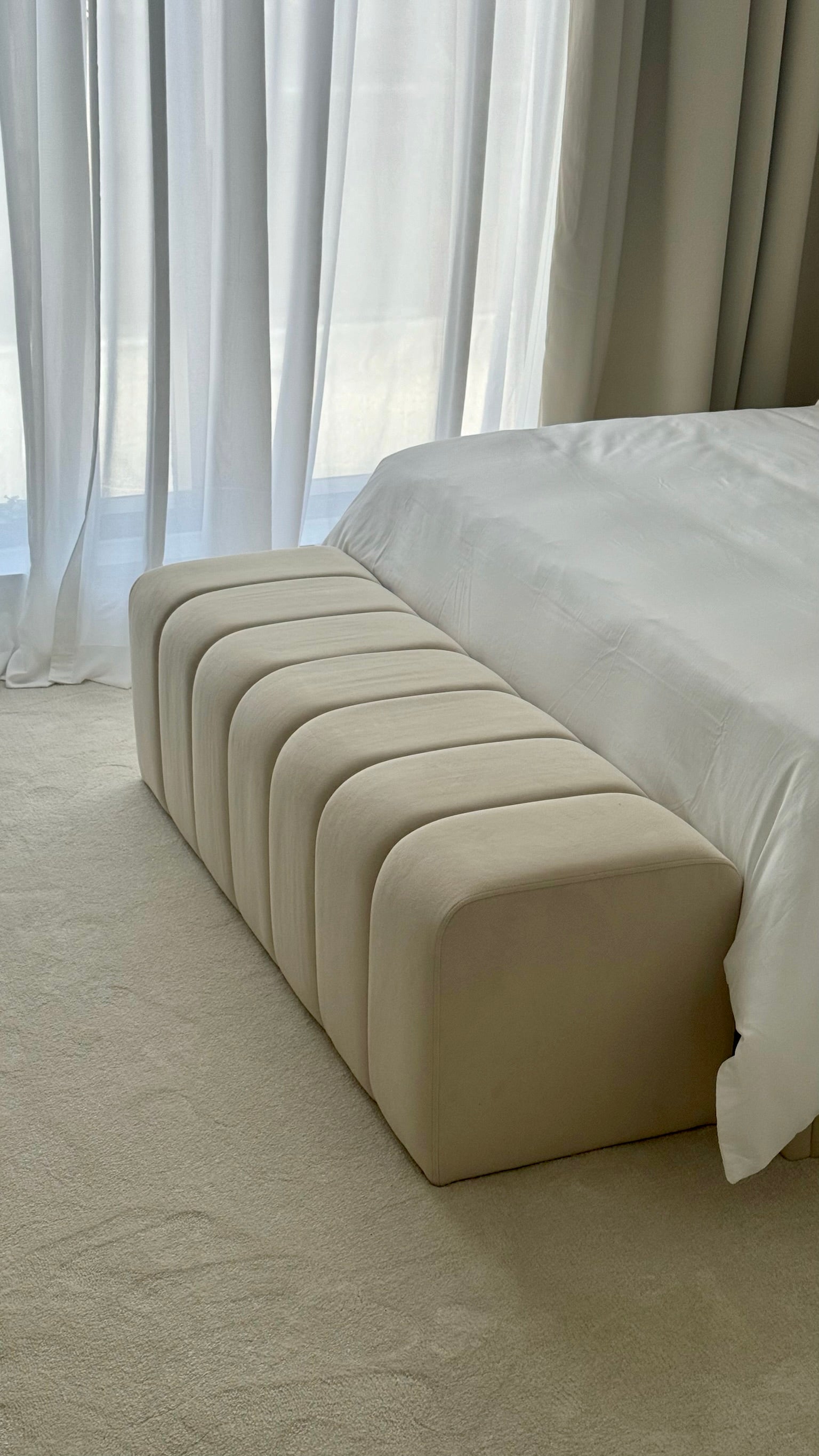 Discover the perfect blend of style and comfort with our luxurious Ottoman Bench. Featuring a sophisticated cushioned cream fabric, this statement piece exudes elegance while offering a plush seating experience. Its timeless design effortlessly complements any interior, adding a touch of refinement to your living space. Ideal for both contemporary and classic settings, our Ottoman Bench is a versatile addition to elevate your home decor with unparalleled beauty and comfort.