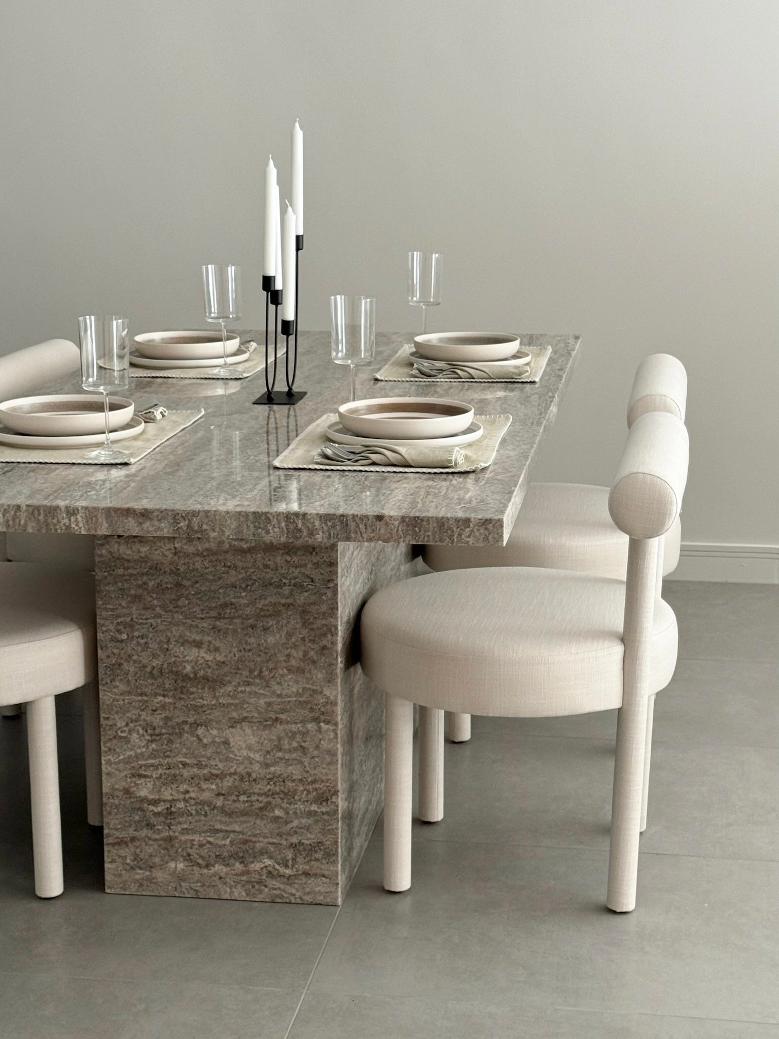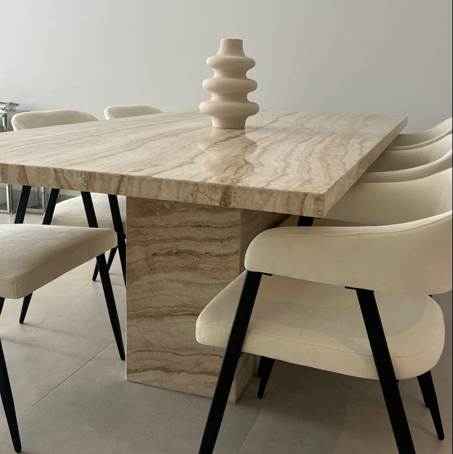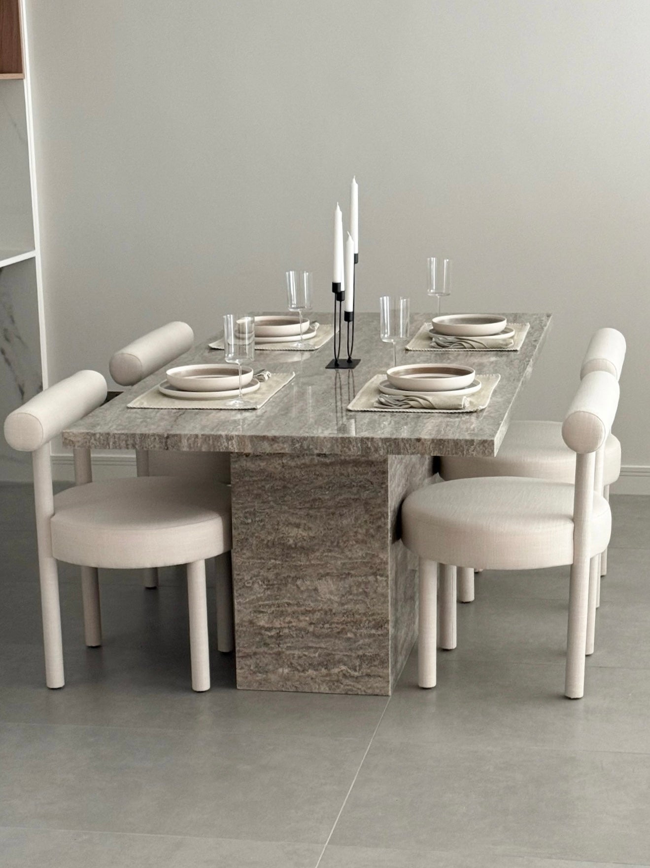 The Penelope Travertine Dining Table is a sophisticated piece that combines natural beauty with contemporary design, creating a perfect centerpiece for your dining space. Its clean lines and minimalist design, seamlessly integrates with various interior styles, from modern to classic. Crafted from high-quality travertine, known for its unique texture and natural color variations. This luxurious material adds a touch of sophistication and an inviting ambiance to your dining area.
