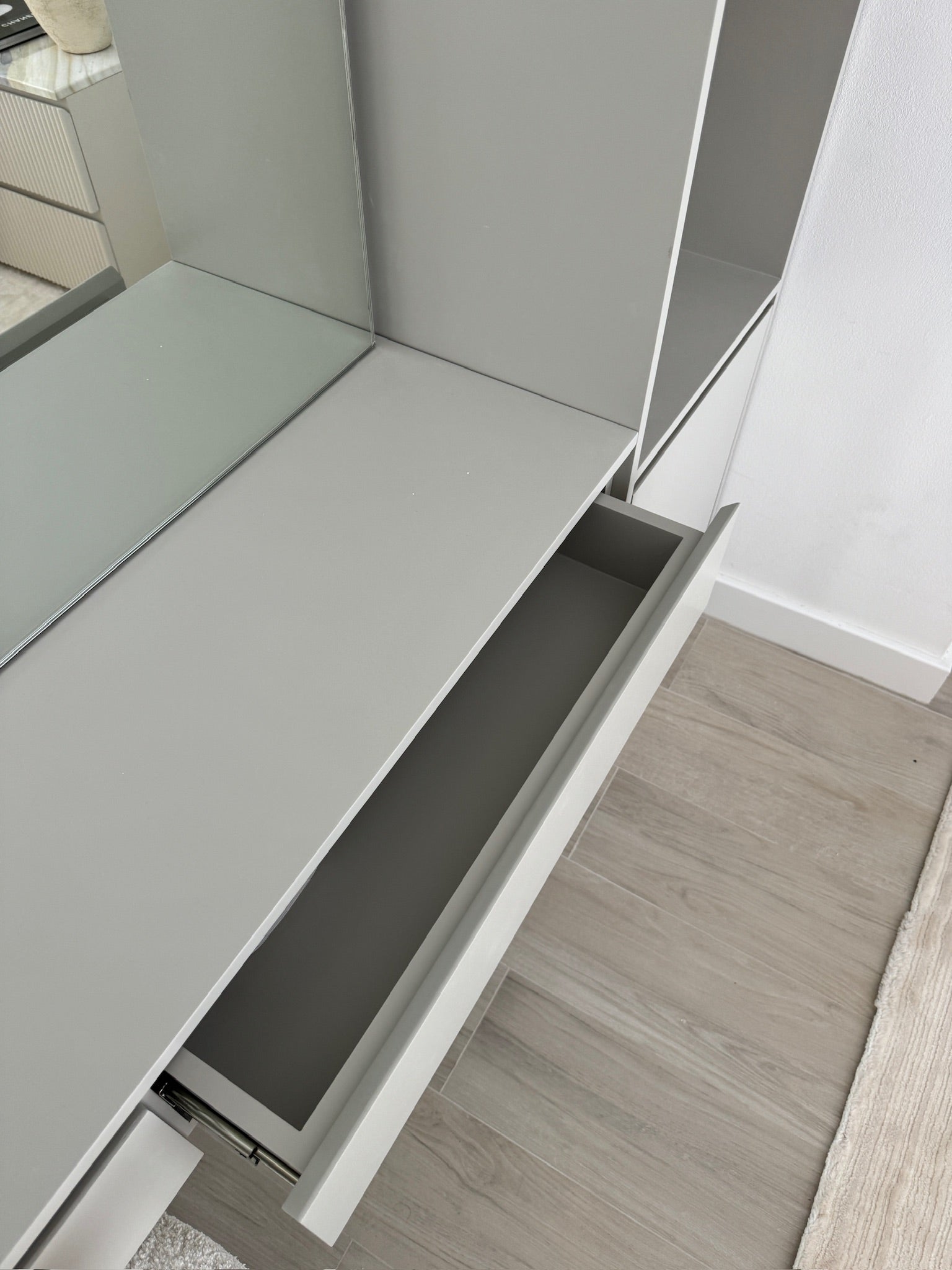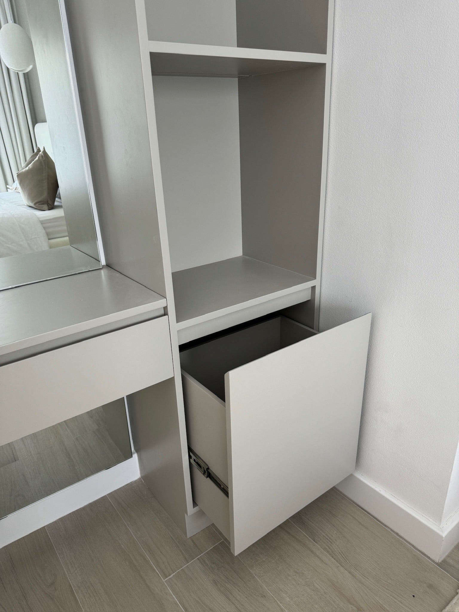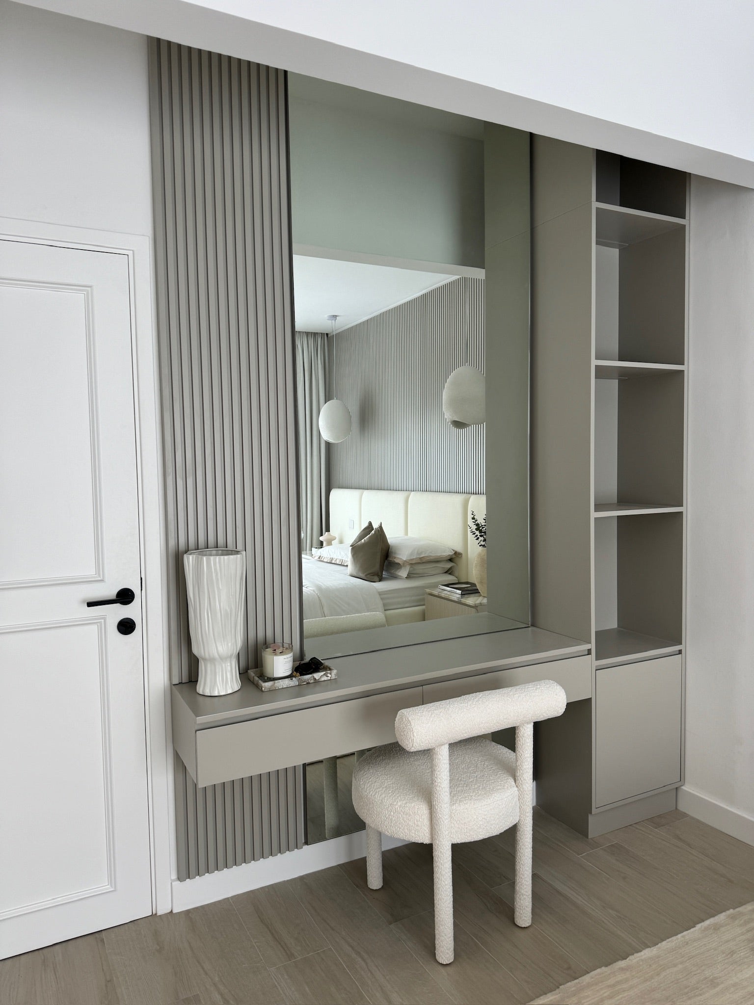 The Phoebe Dresser meticulously crafted to elevate your bedroom is integrated into the wall to maximize space and provide storage while maintaining a sleek and cohesive look. Alongside are shelves for decors / accessories. Behind is a fluted panel running vertically and a large mirror that extends from the floor to the ceiling, providing a full-length reflection to visually expand the room by reflecting light and space.