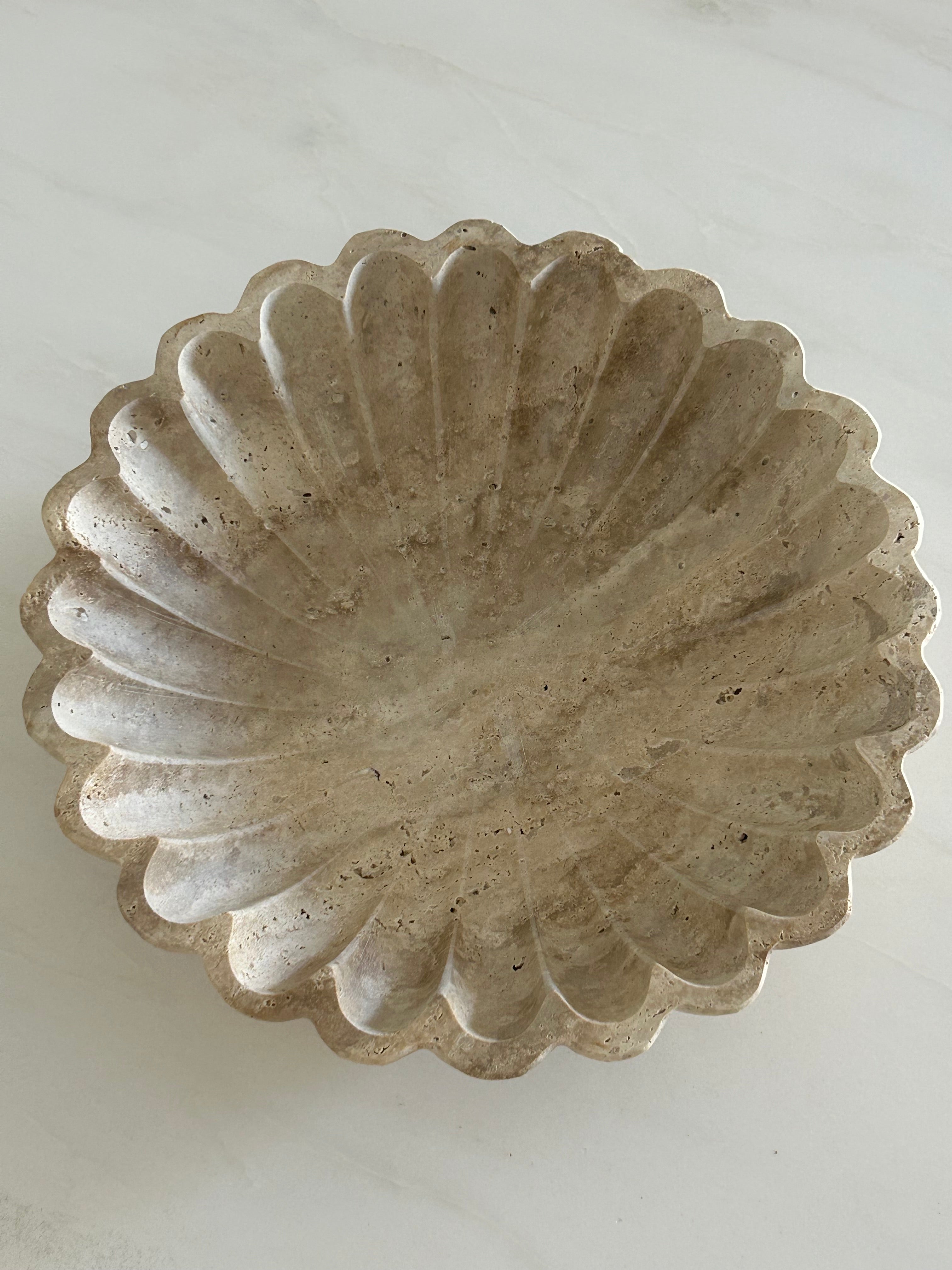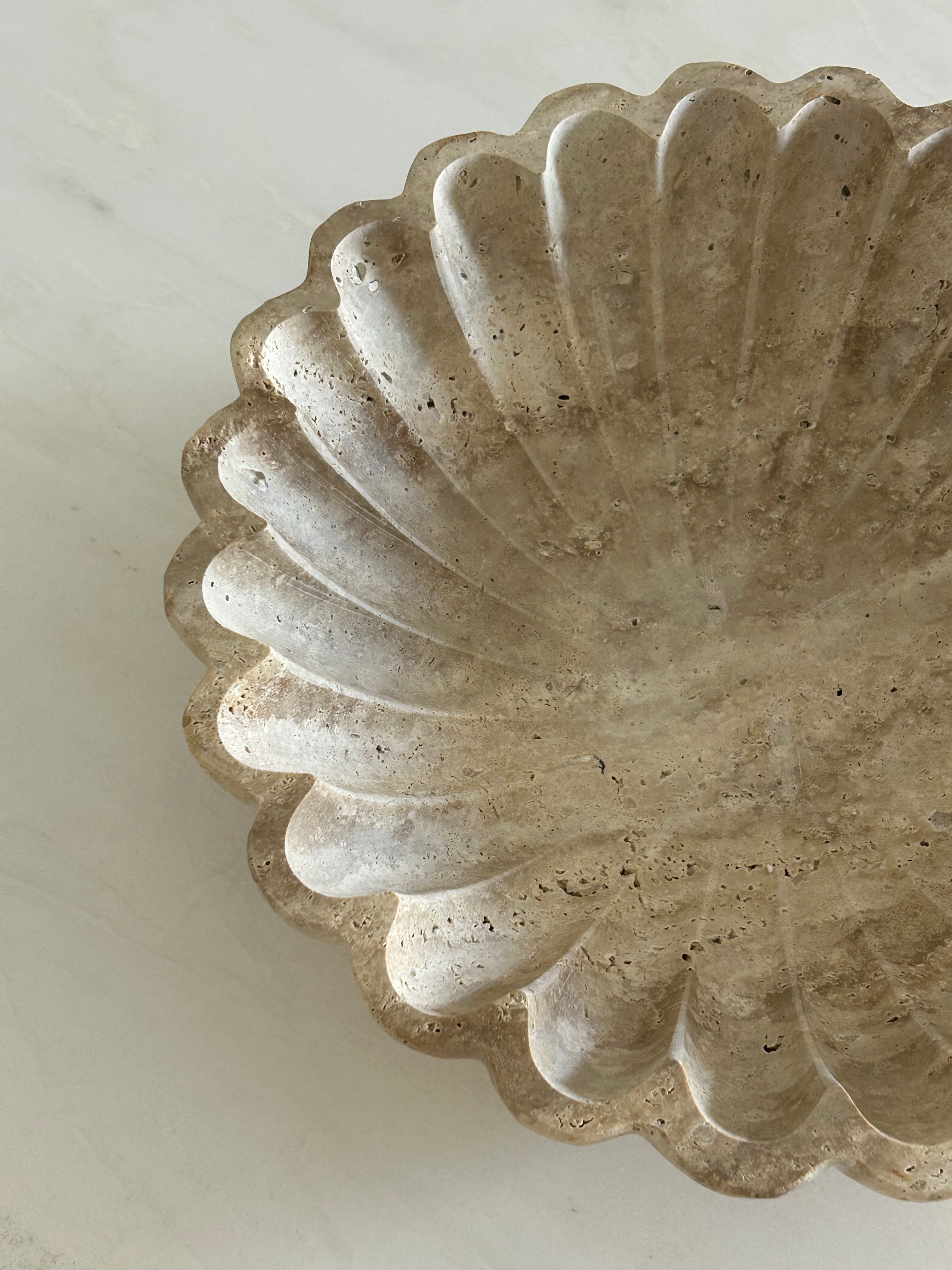 The Rae Travertine Scallop Fruit Bowl is crafted from natural stone, it features a unique scalloped design that adds an elegant touch to any setting. Its neutral tones and textured surface provide a sophisticated, rustic charm, making it a versatile piece that complements both modern and traditional interiors. Perfect for serving fruit, holding decorative items, or as a standalone centerpiece.