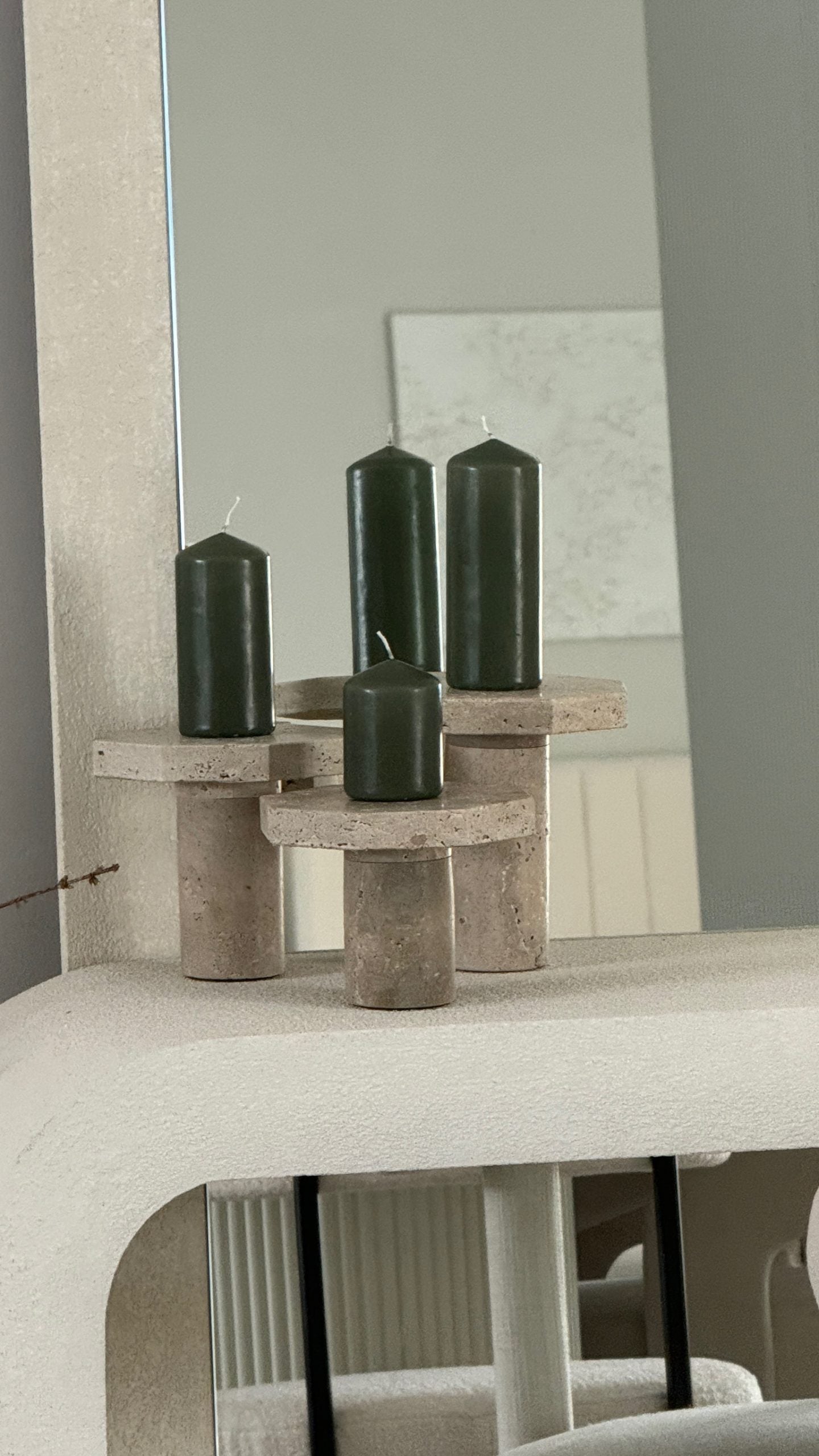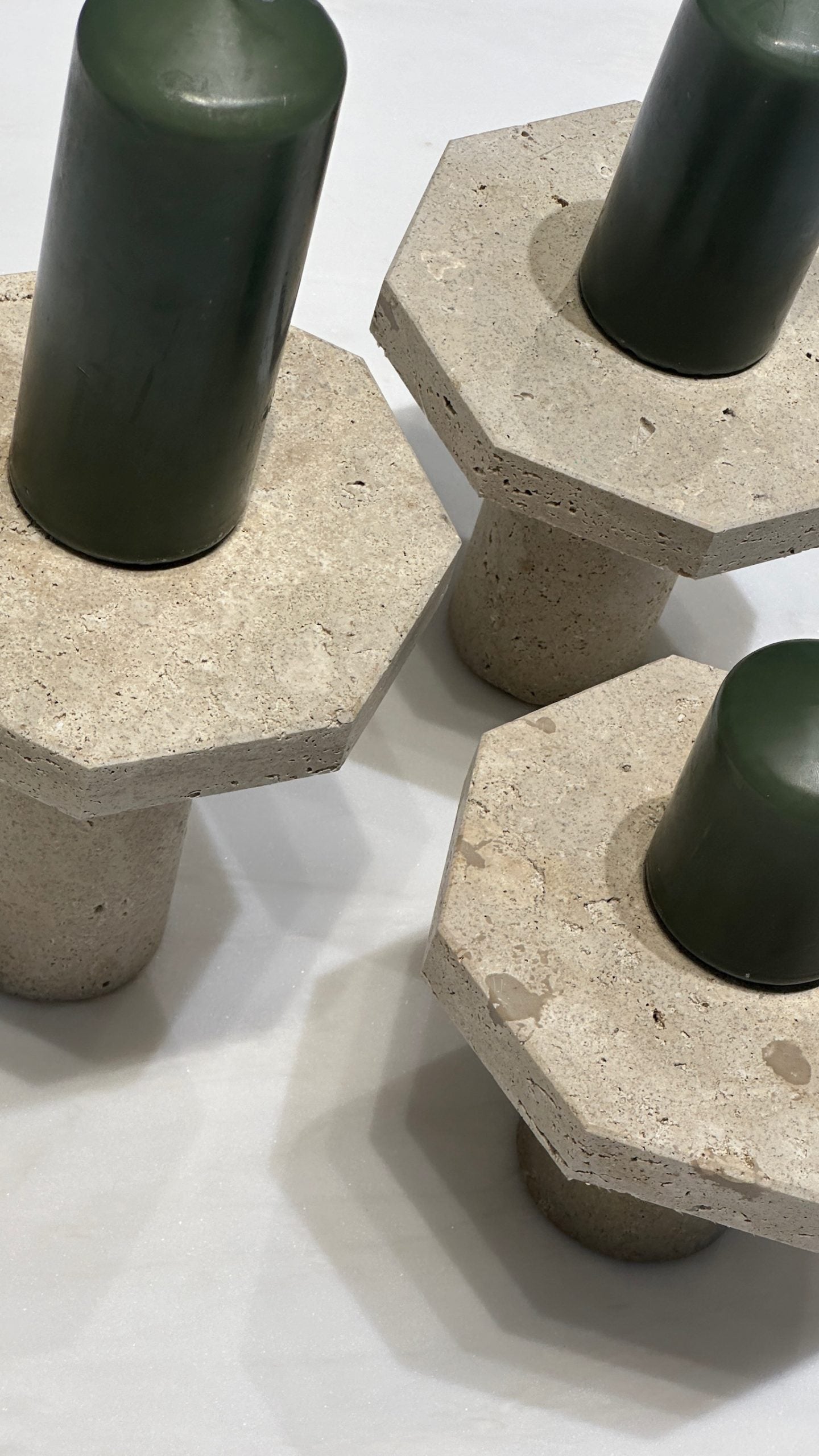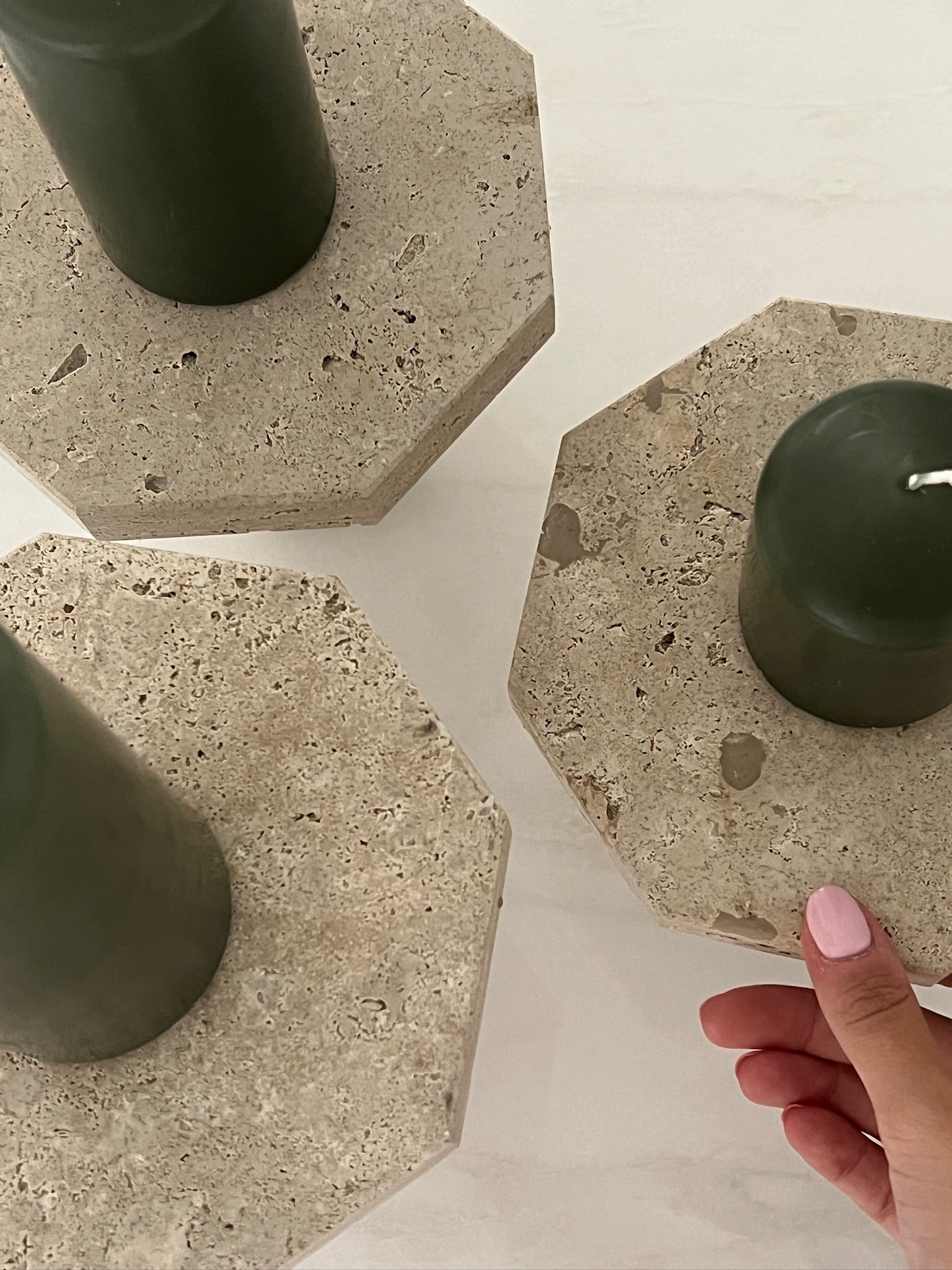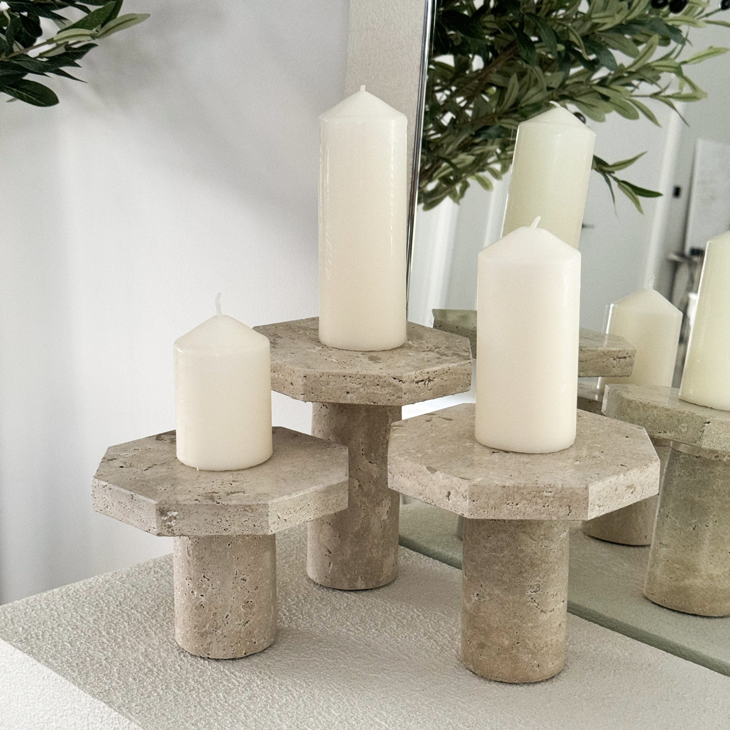 Add a touch of sophistication to your home with the natural beauty and timeless elegance of our Rae Travertine Set of Three Octagon Candle Pillars. Expertly crafted from travertine, these pillars feature a harmonious blend of texture, making them a perfect addition to any decor style to create a cozy, ambient glow. Each pillar showcases unique veining and color variations, ensuring that no two pieces are alike. The octagonal tops paired with cylindrical bases provide a modern, geometric aesthetic that adds a touch of sophistication to any setting.