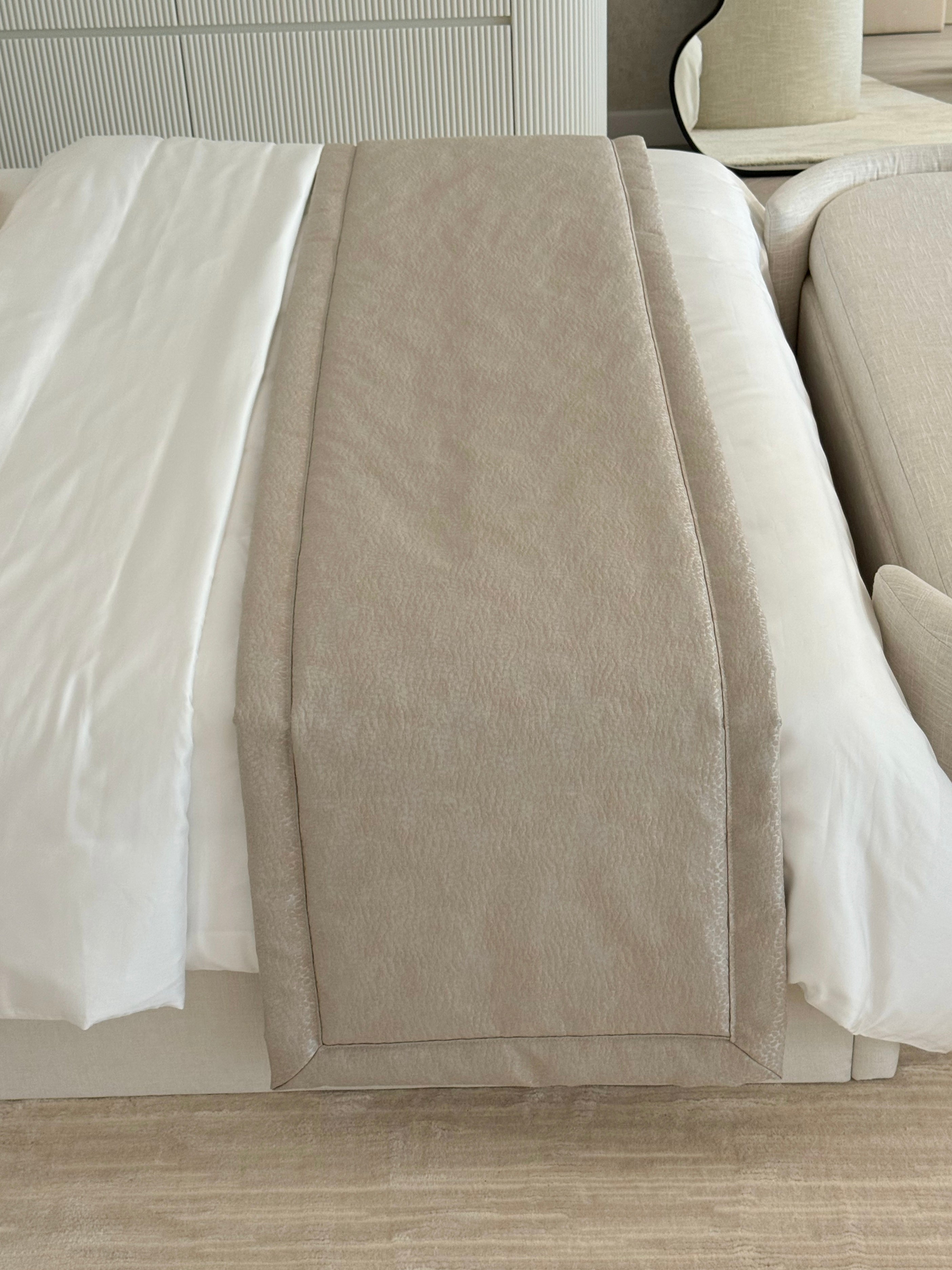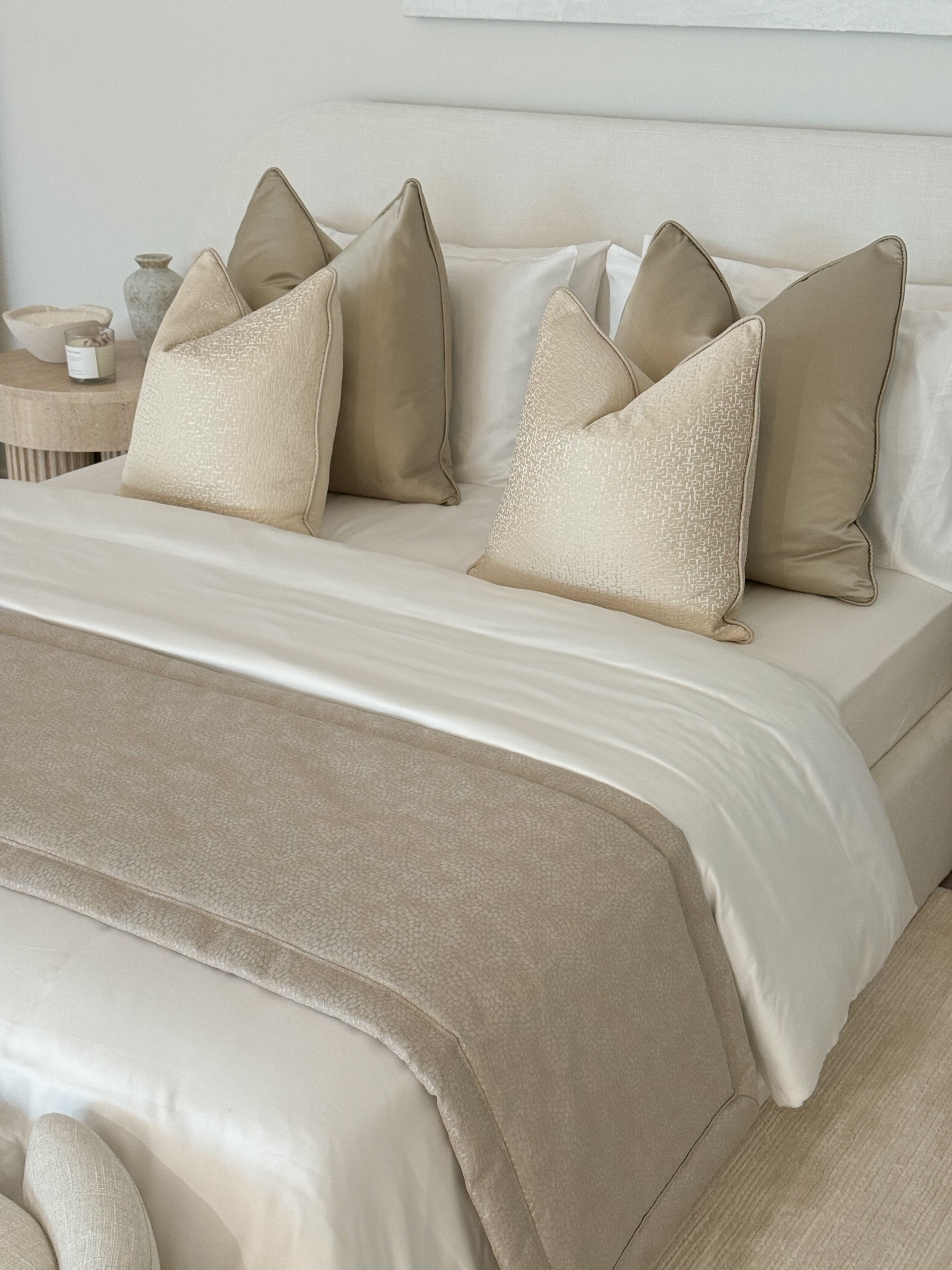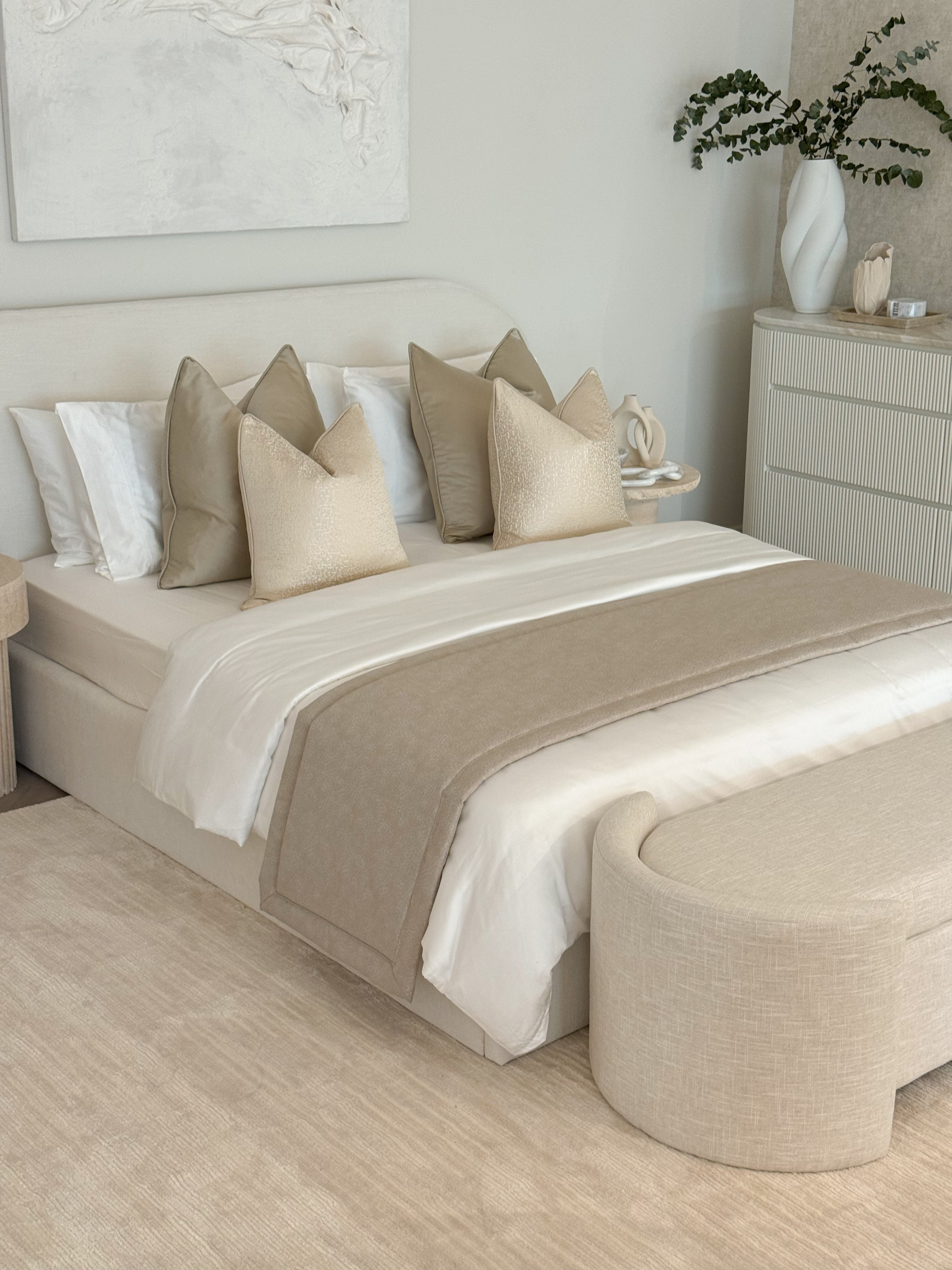 The Remi Bed Runner is a bespoke piece crafted from luxurious satin-touch material, offering a soft and elegant finish. Available in four neutral colours, it effortlessly complements a variety of bedroom styles. You can choose between a sleek, borderless design for a minimalist look or a version with borders for a more tailored, refined finish.