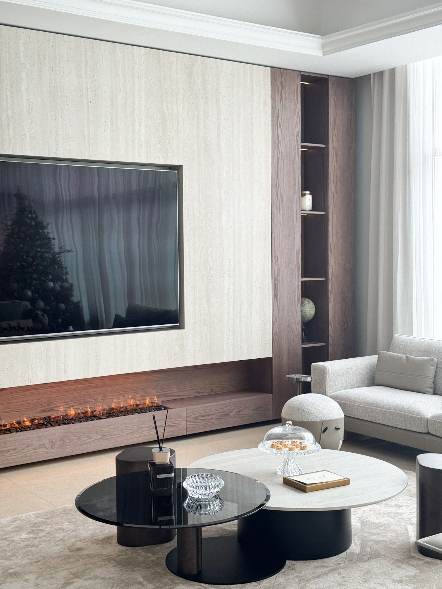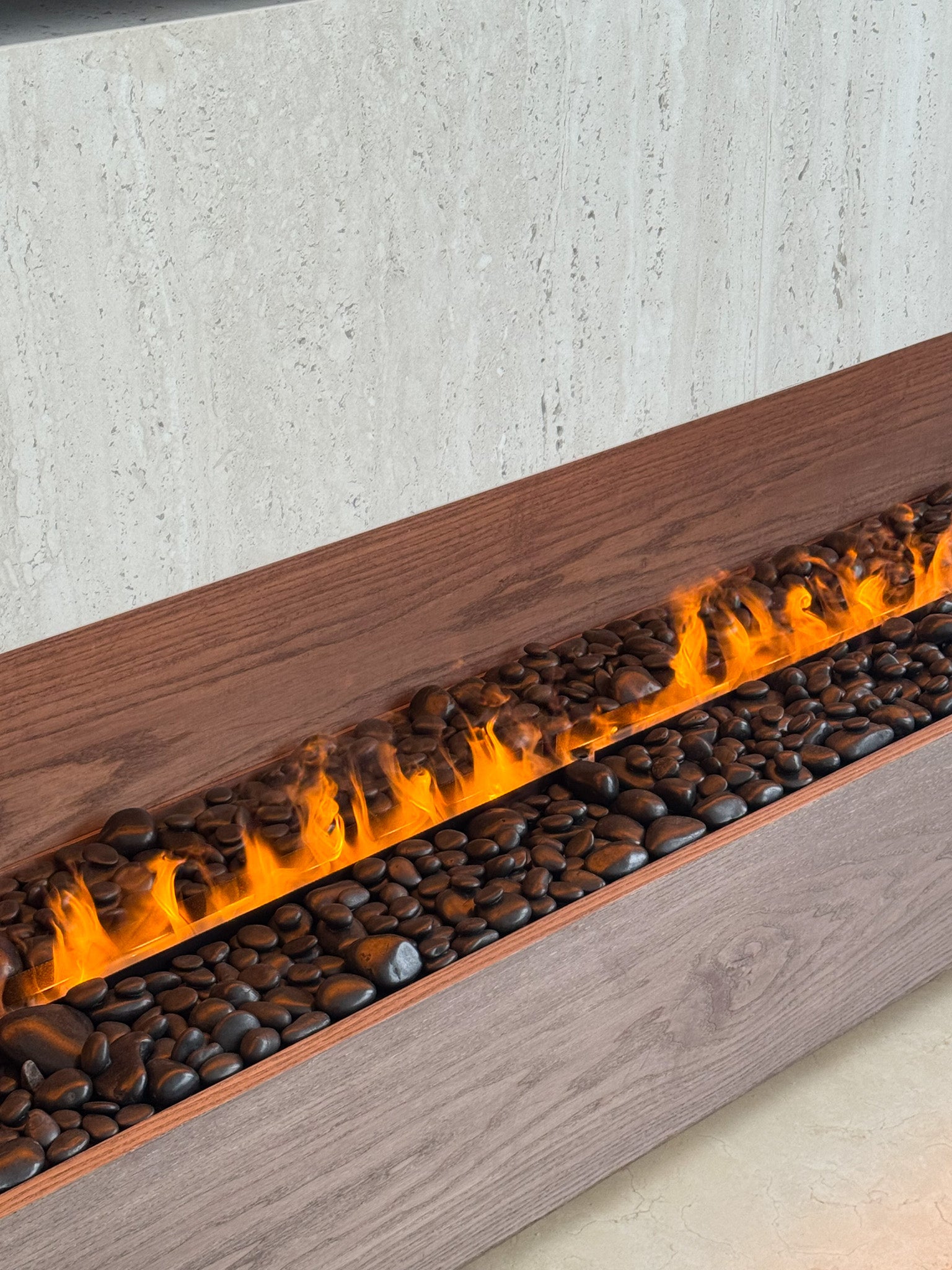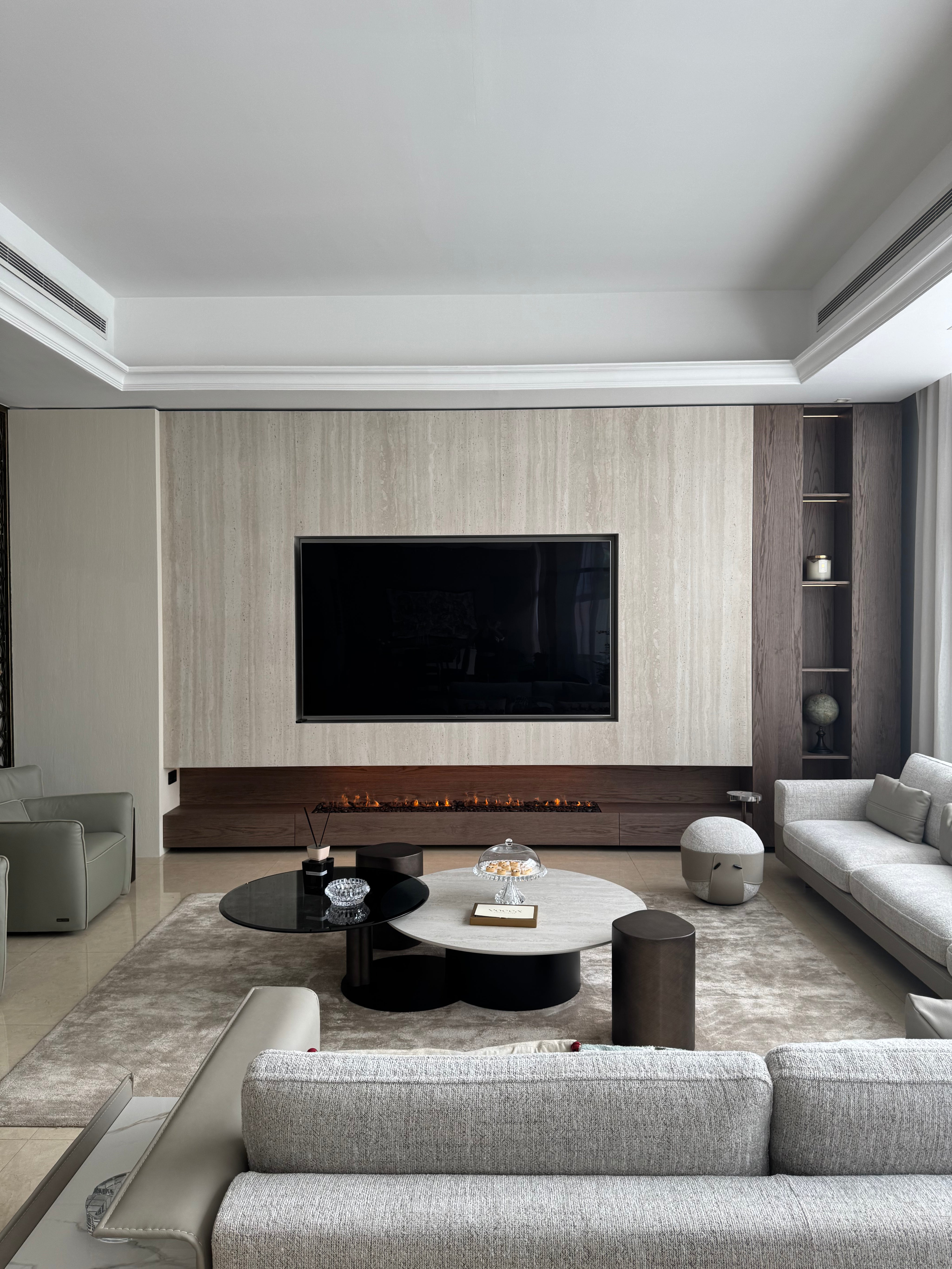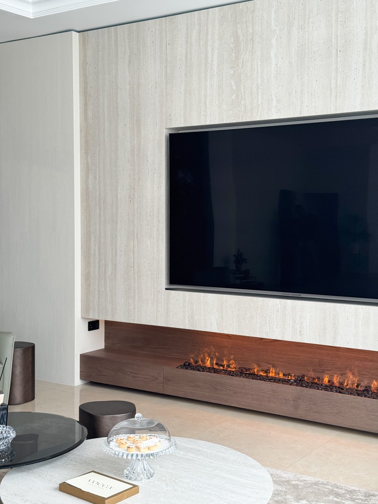 Below, a custom floating wood console anchors the design, finished in a rich, warm tone that contrasts beautifully with the stone. Integrated within the console is a sleek linear fireplace, delivering both visual warmth and ambient luxury. The concealed detailing ensures uninterrupted flow, allowing the flame to appear effortlessly embedded within the architecture.