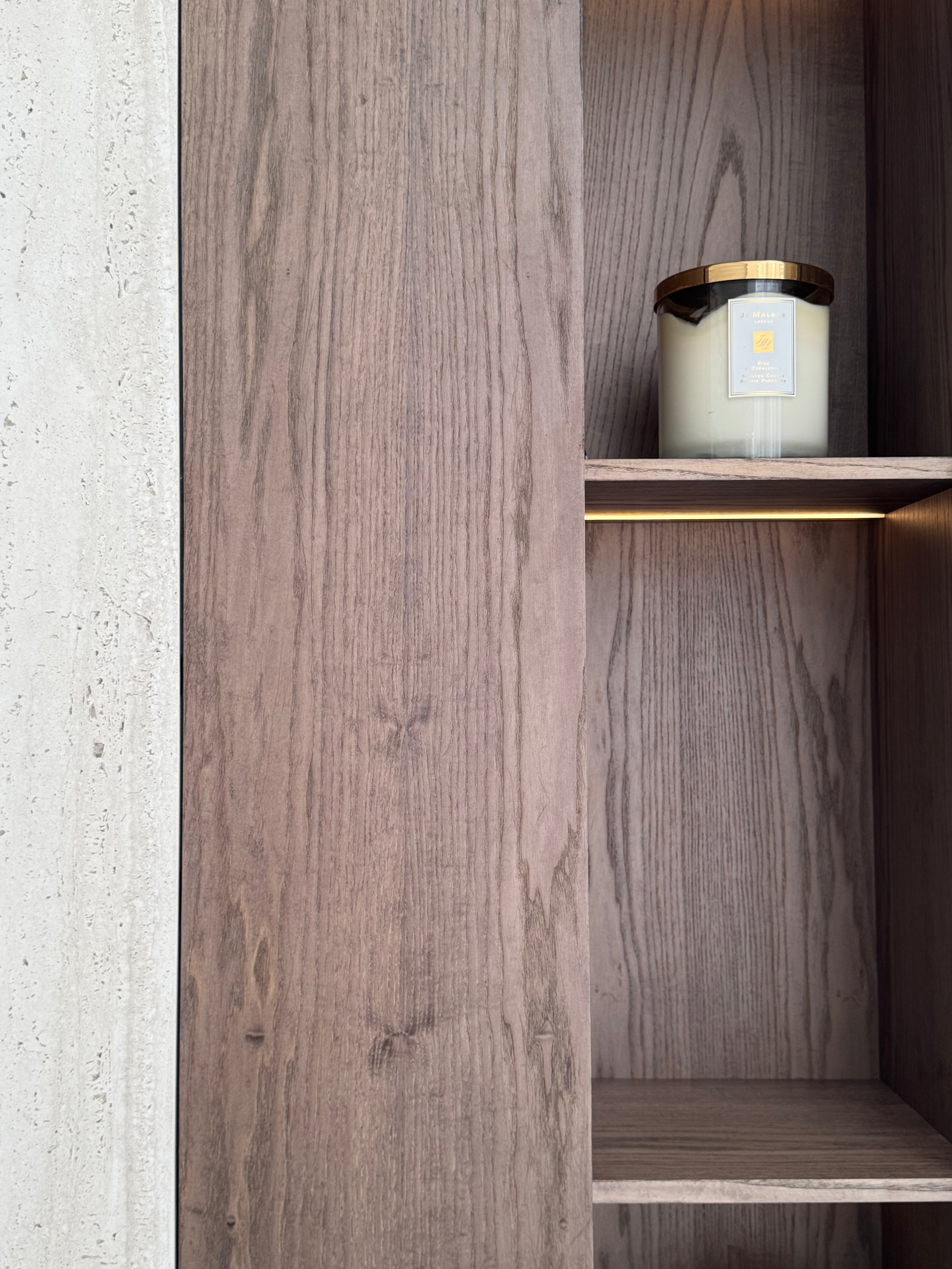 The Robin Media Wall is a masterfully crafted centerpiece designed for refined living spaces where elegance meets precision. At its core, the Robin Media Wall showcases a full-height travertine stone backdrop, selected for its soft veining and organic texture. The stone surface creates a calm, neutral canvas that enhances the room’s natural light while adding depth and timeless sophistication. A perfectly recessed wall-mounted television is framed with crisp detailing, maintaining clean sightlines and a minimalist aesthetic.