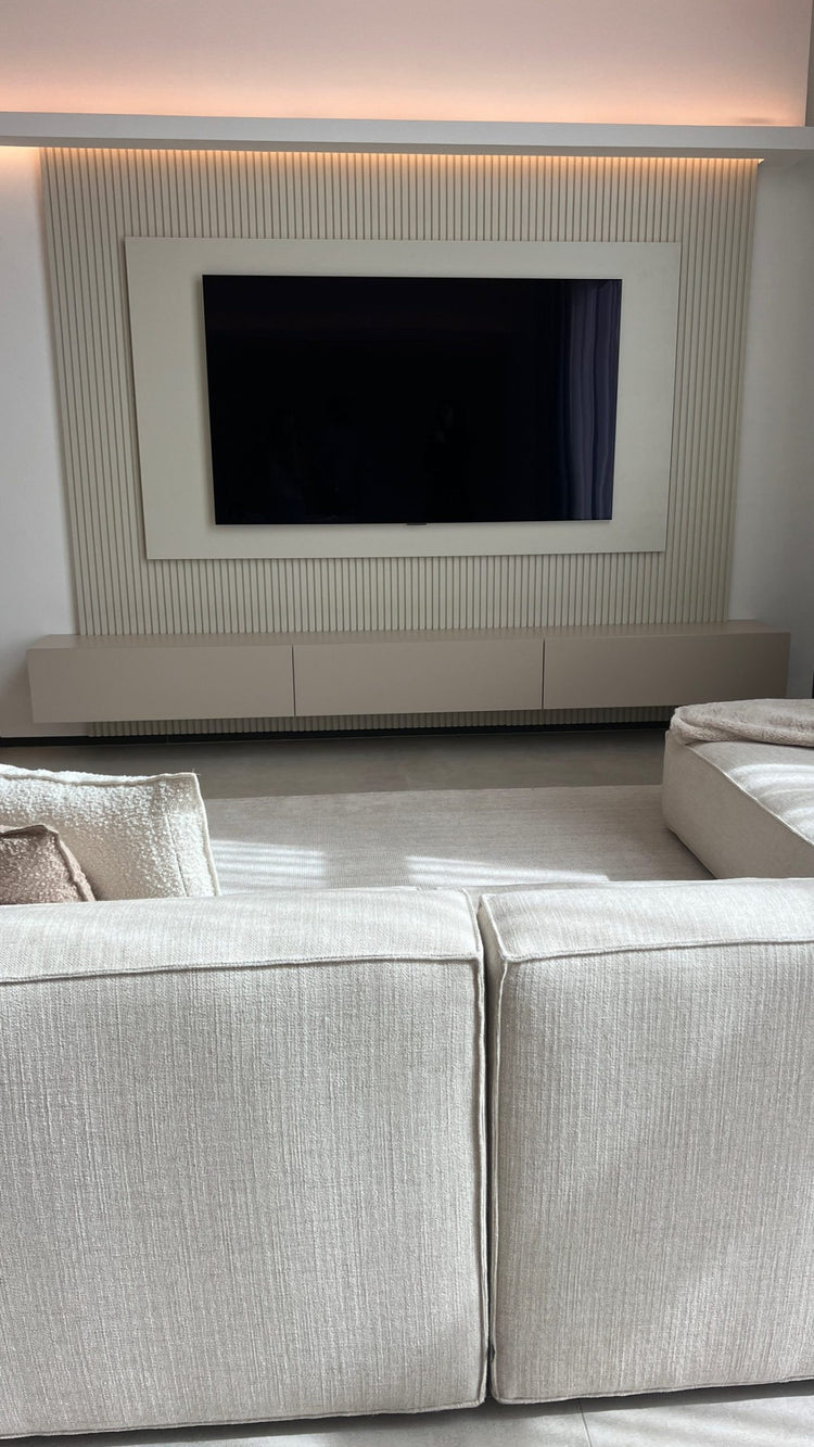 The Rowan Media Wall consist of a board panel, rectangular fluting panel and a floating cabinet combining modern aesthetics with functional storage. It is sleek and minimalistic, while adding texture and visual interest to the space.