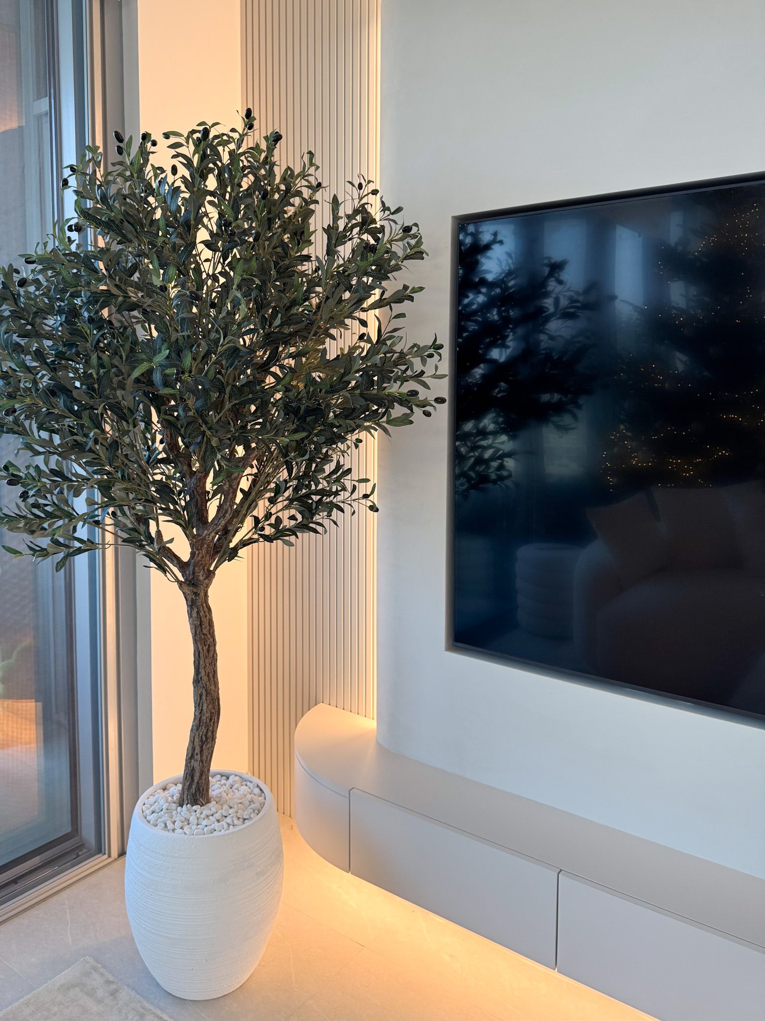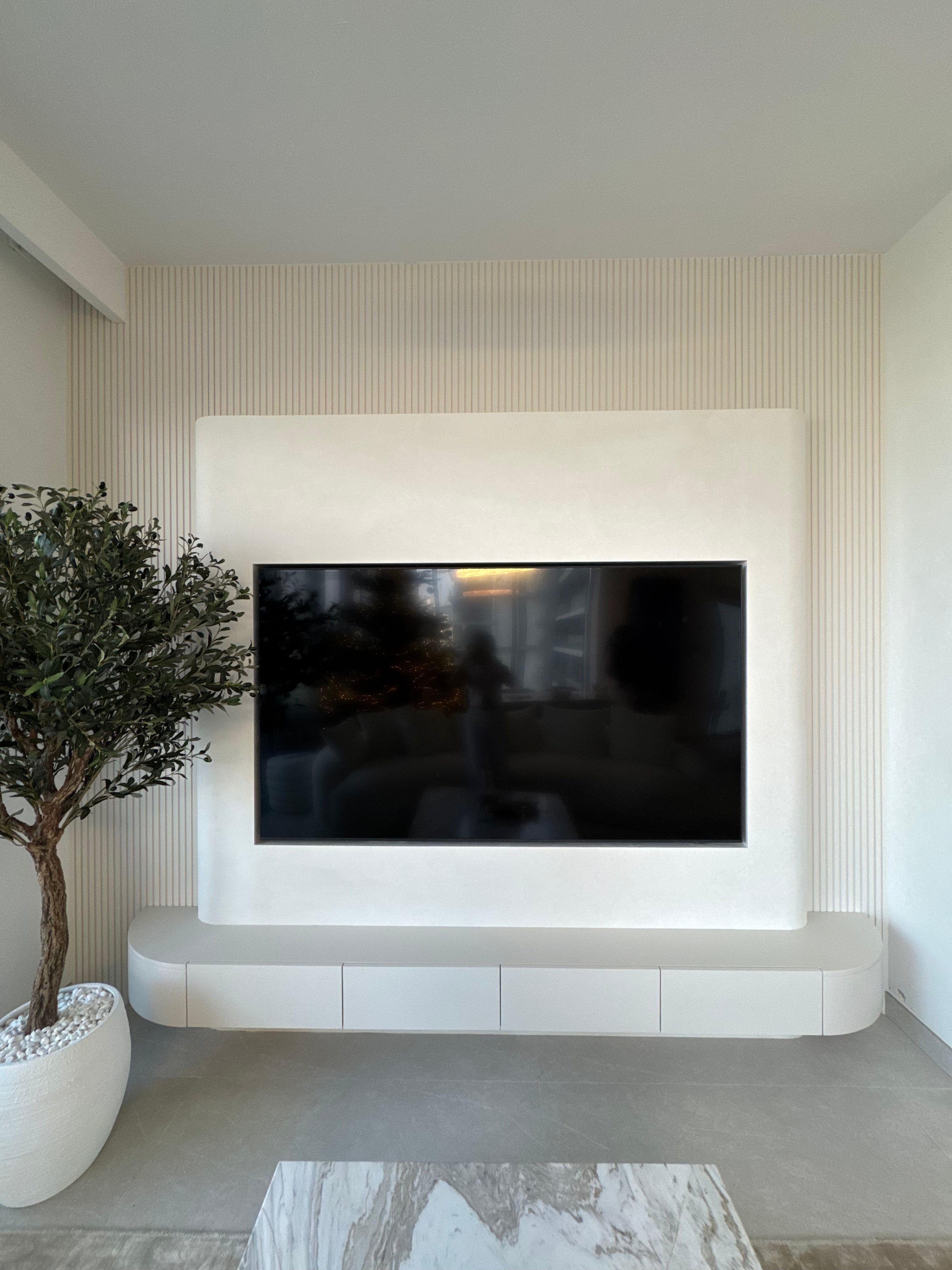 The TV is seamlessly framed within a softly contoured panel, enhanced by concealed LED lighting that adds depth without distraction. Below, the floating media console with weightless, offering discreet storage while preserving the purity of the design. Finished in a refined neutral palette, the Sam Media Wall blends effortlessly into luxury villas, high-end apartments, and curated residential interiors.