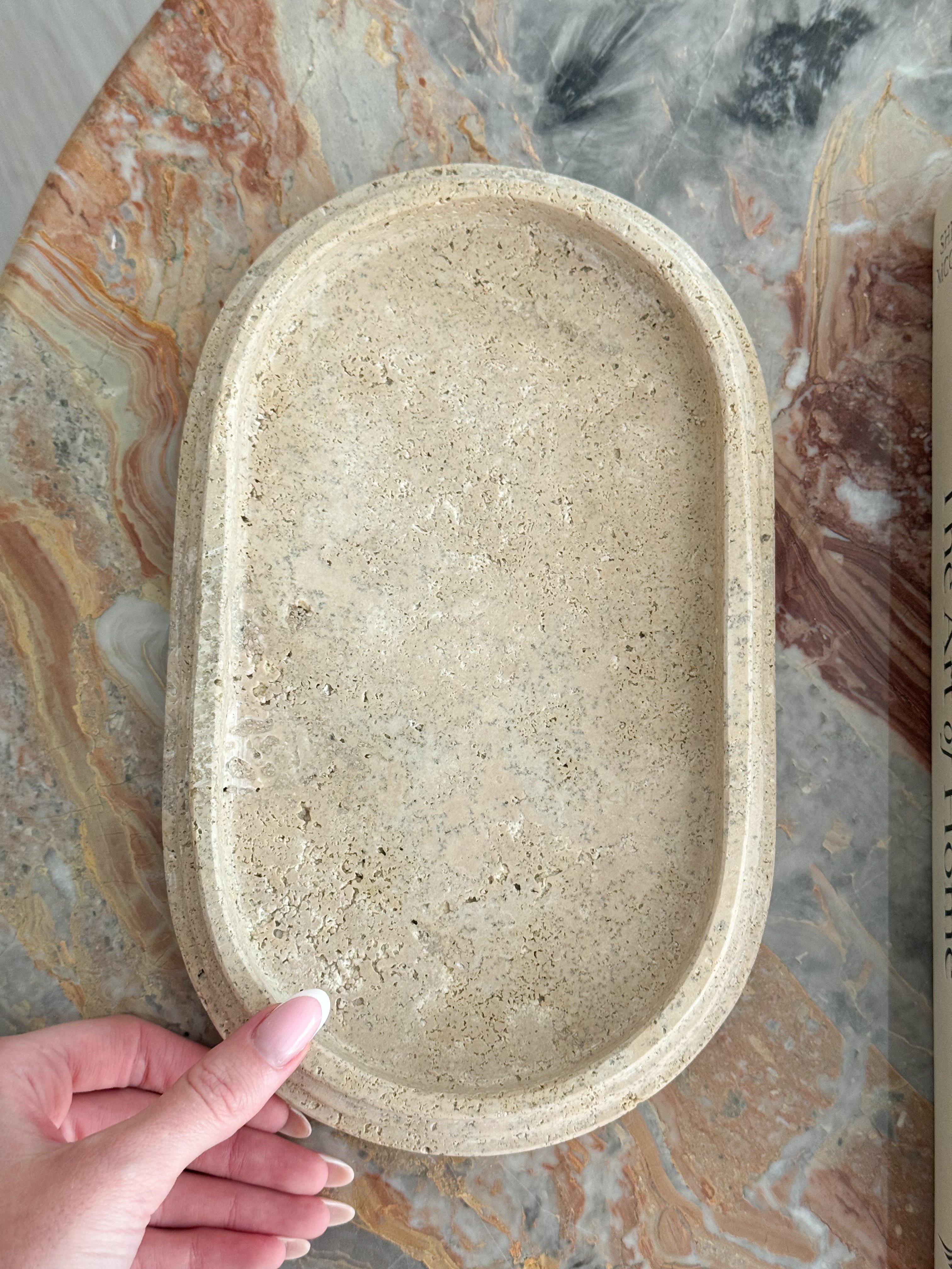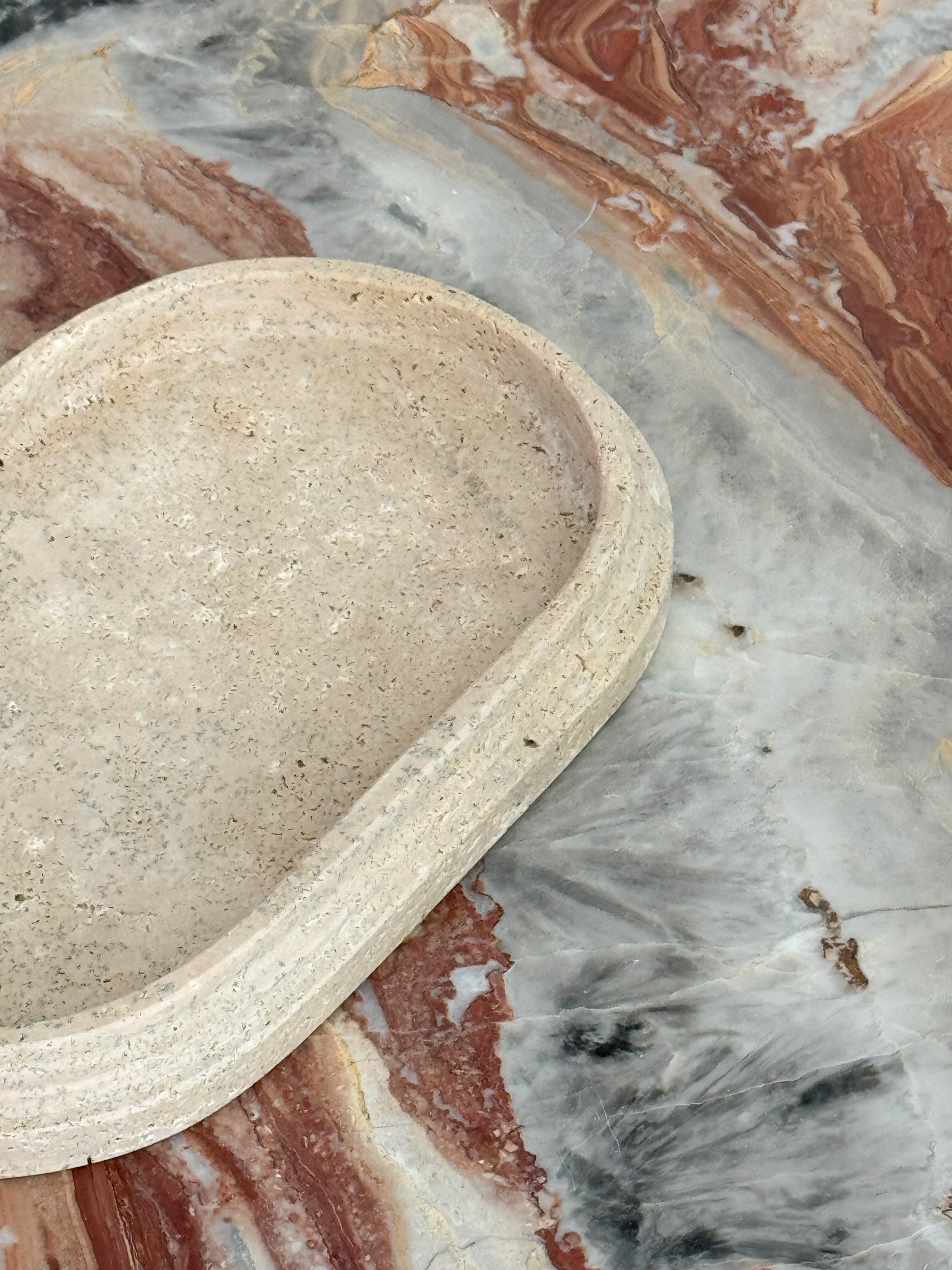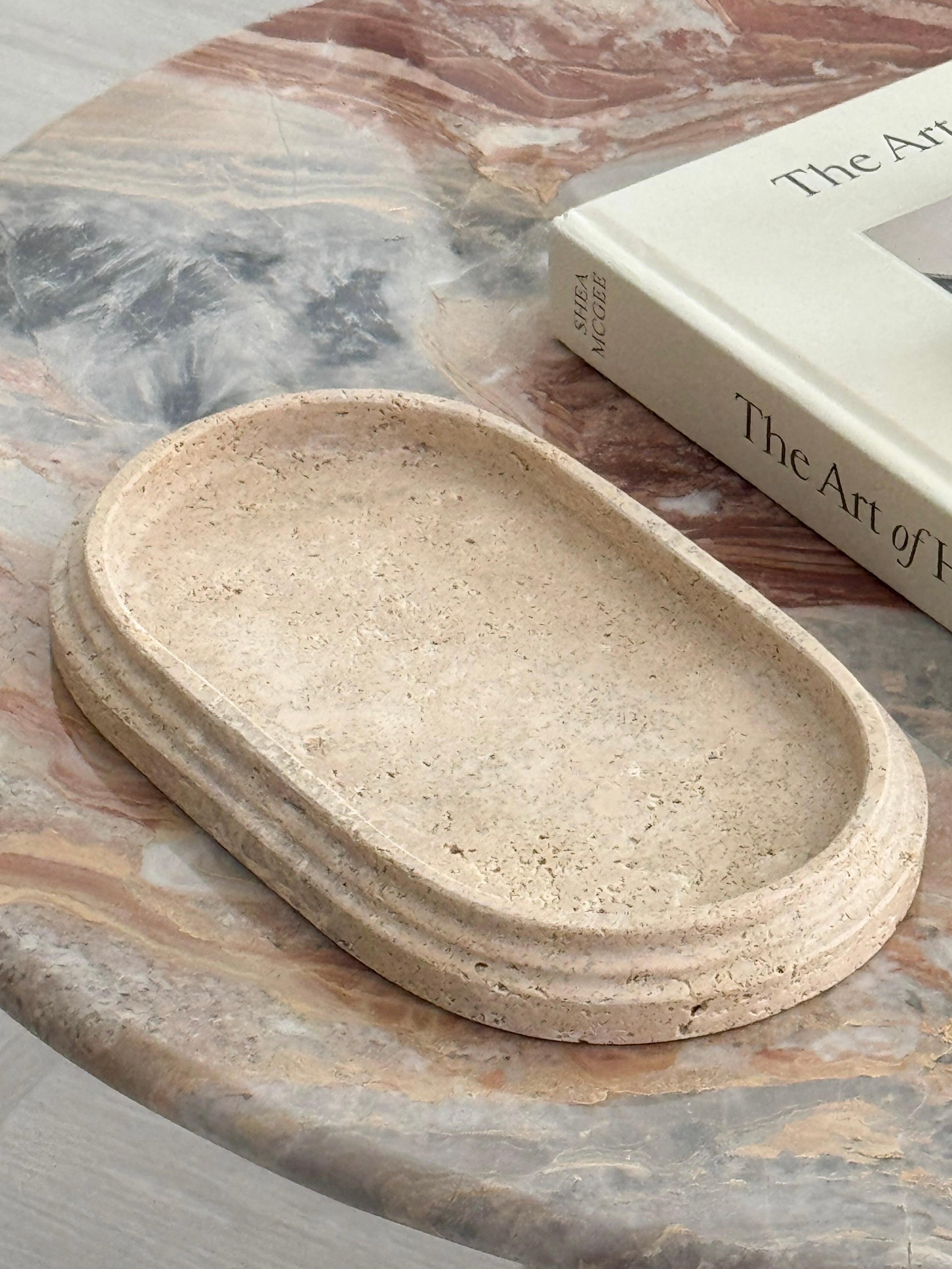 The Shanae travertine tray combines natural elegance with minimalist design, making it a versatile piece for displaying jewellery, decor, or everyday essentials. The smooth, matte surface in warm beige tones highlights the stone's subtle texture, while the gentle curves of the oval shape create a soft, refined aesthetic.