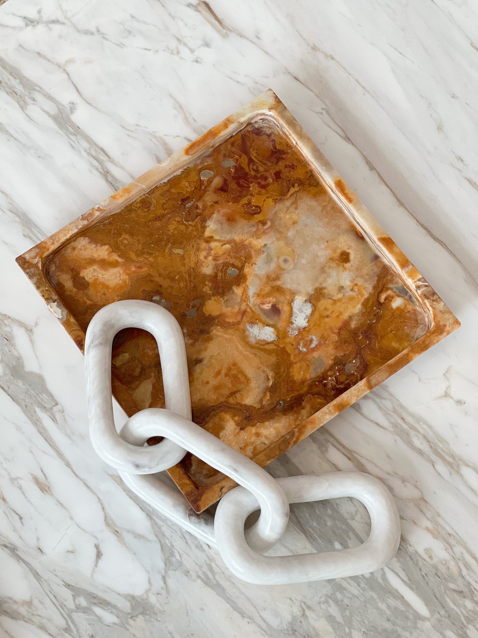 Introduce a blend of sophistication and natural beauty to your display with our Jade Square Onyx Tray, a twist on our jade green tray this beautiful piece displays contrasts of red and oranges. Meticulously crafted from onyx with distinctive veining patterns, this tray provides a luxurious resting place for your precious items. Perfect for organizing and showcasing your jewelry, this onyx tray is a statement of fine craftsmanship and timeless elegance.
