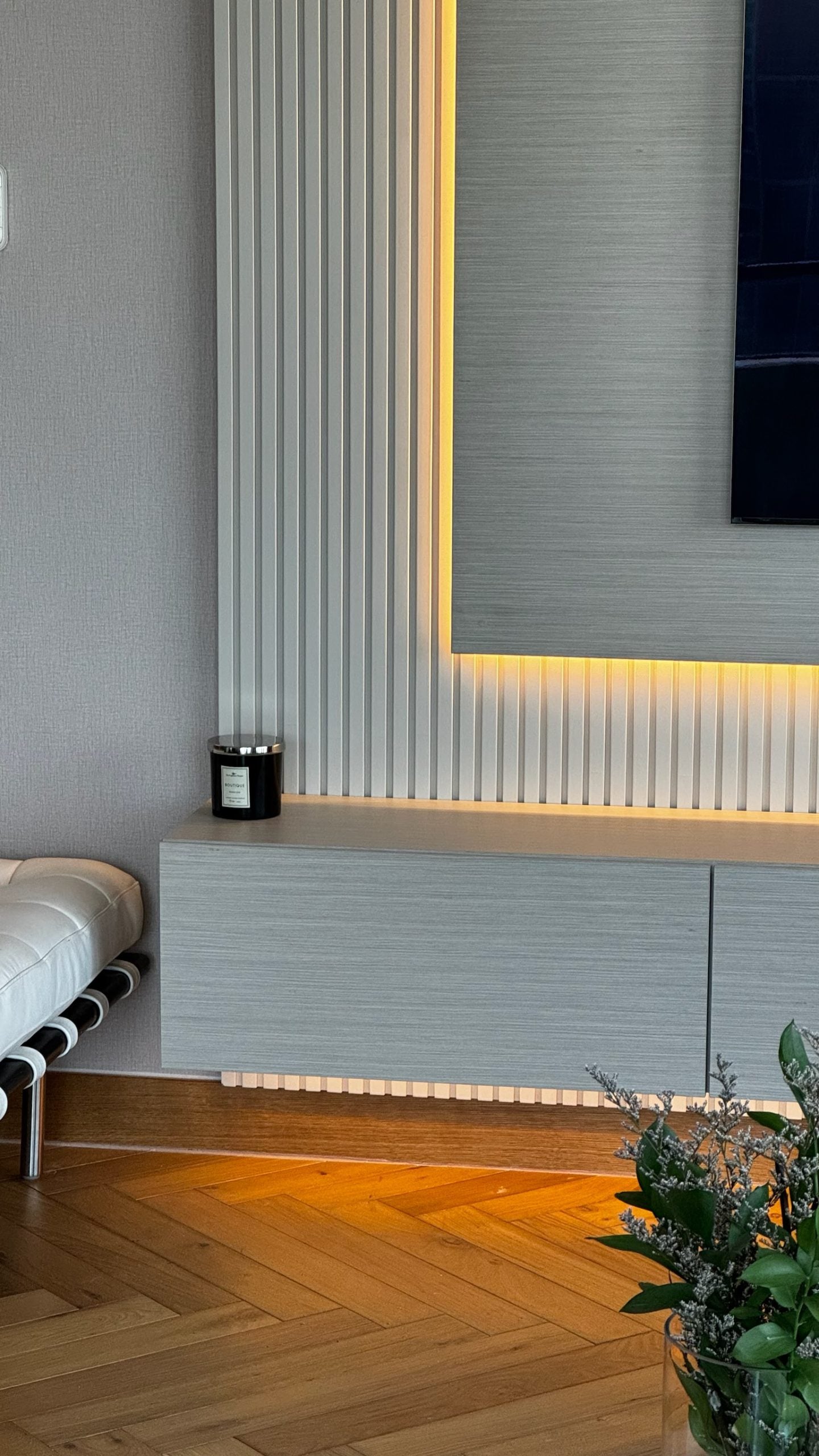 The Slater Media Wall features a fluted panel that extends across the wall. The sleek, clean lines for the TV panel and floating cupboard wrapped in light neutral toned veneer adds depth and interest to the design. Our Slater is functional but also aesthetic.