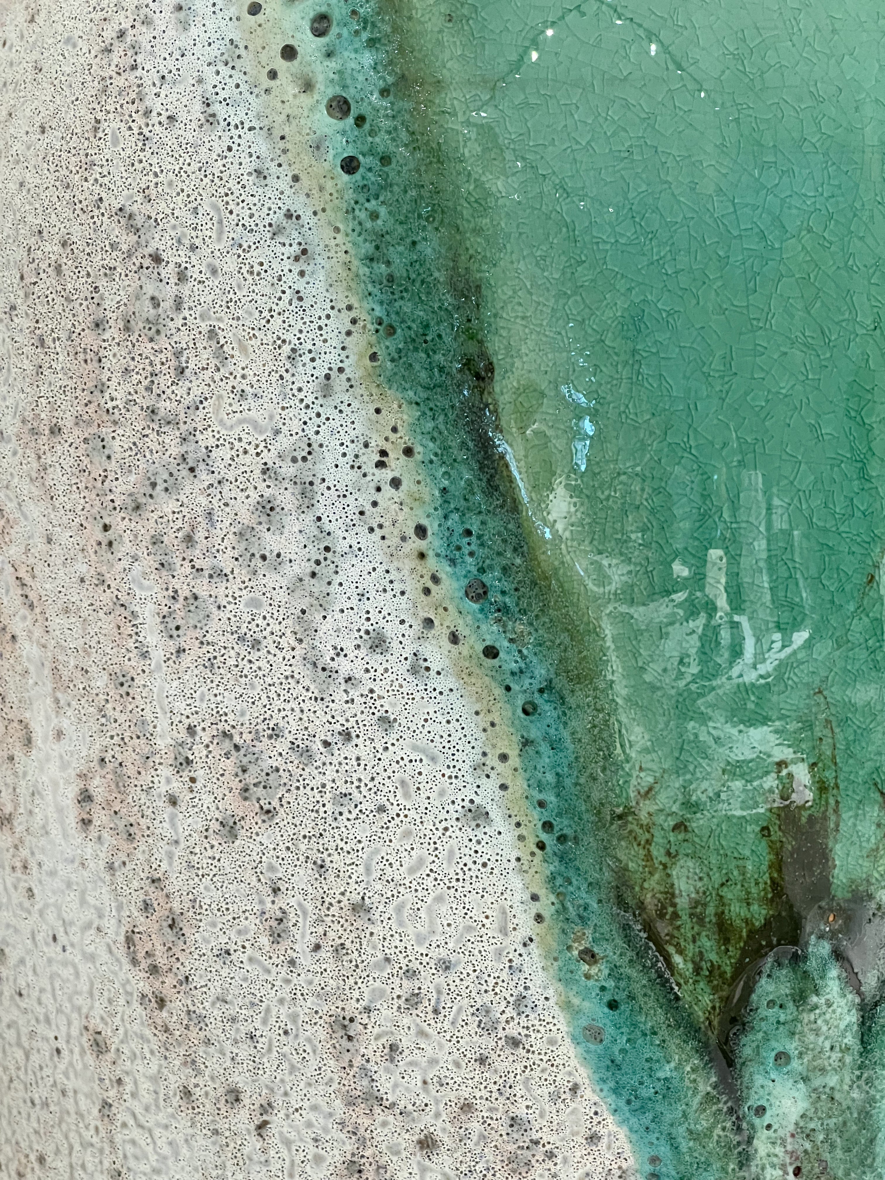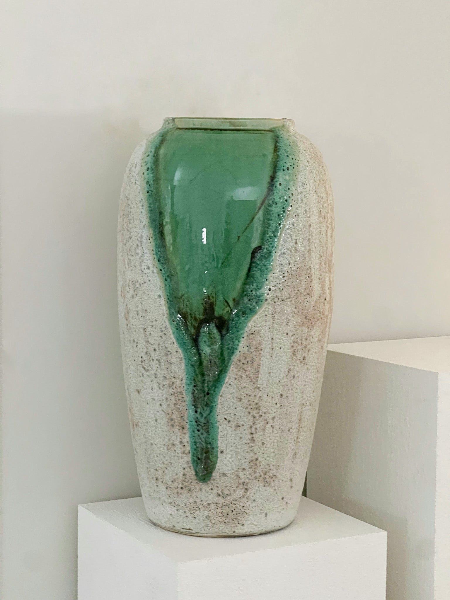 Make a bold statement with our large textured vase, an exceptional fusion of modern luxury and artistic expression. Its striking, tactile surface is enhanced by a captivating mix of rich neutral tones, accented by a dynamic splash of green and brown that appears to cascade down the vessel. The unique texture and flowing design bring a sculptural quality to any room, while the vivid color contrasts infuse the piece with energy and depth. Whether displayed as a stunning centerpiece or an eye-catching accent, this one-of-a-kind vase effortlessly blends contemporary design with timeless elegance, adding both sophistication and character to your home.