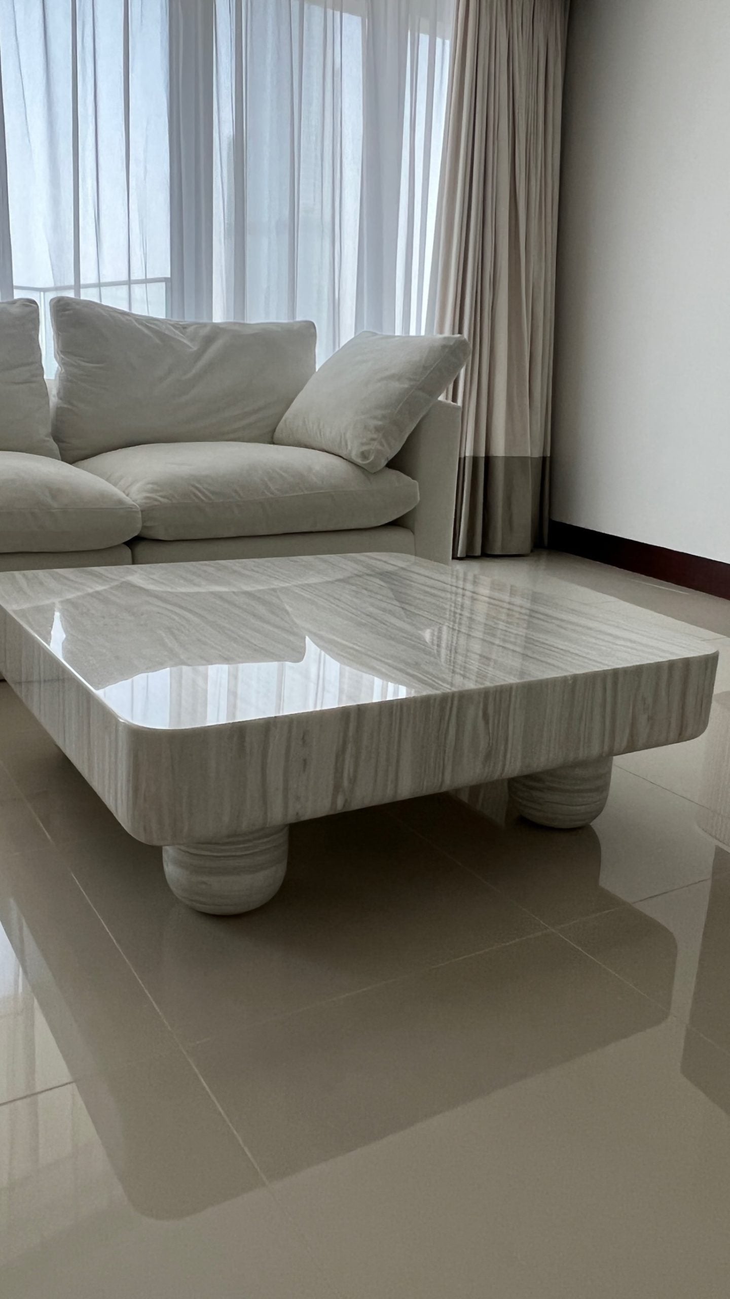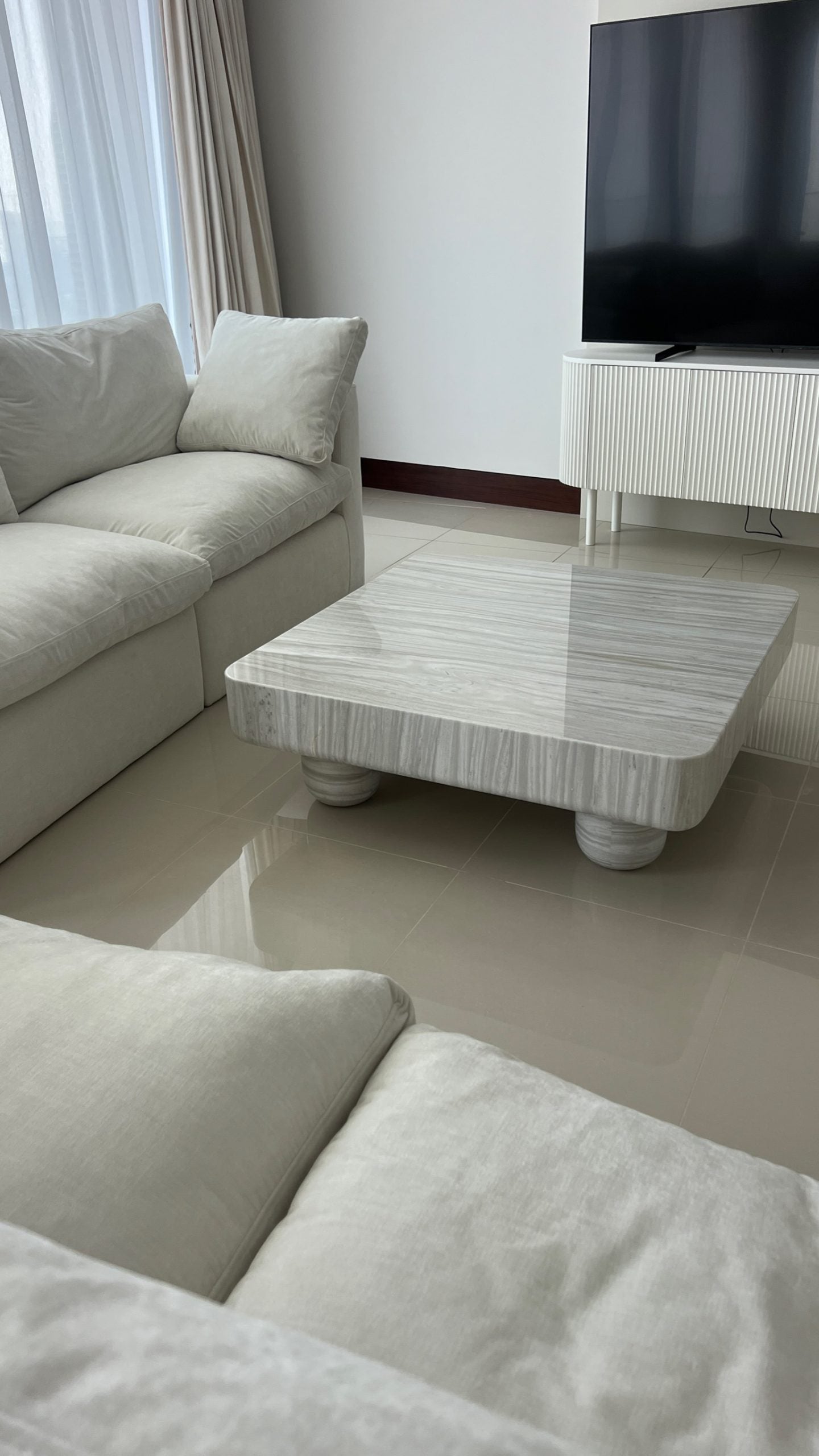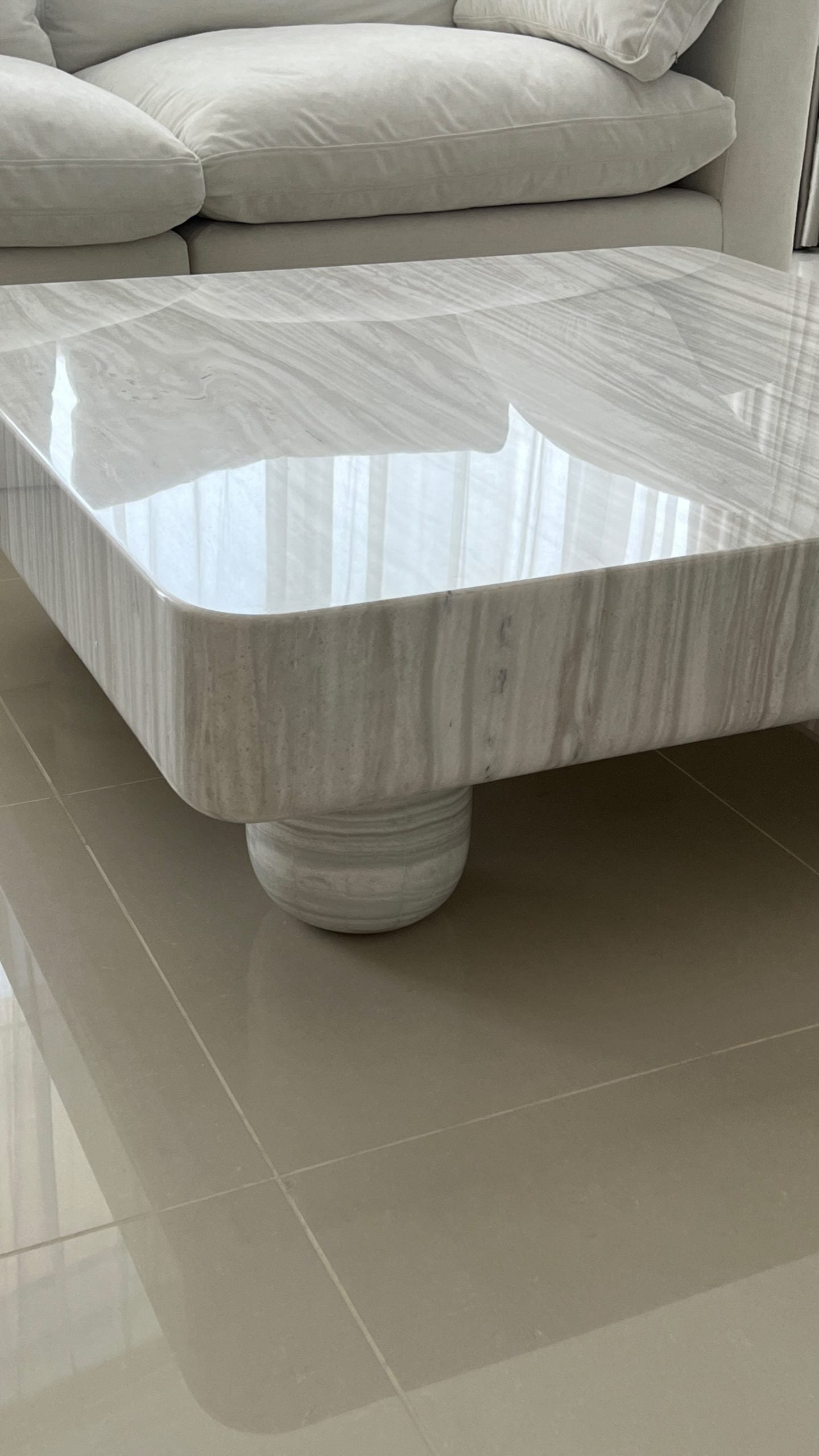 Our Thalia Nesto Grey Marble Coffee Table, with gorgeous round circle legs. This desirable style, is perfect to achieve a stylish and luxury look. Accessories with candles and books for a dream aesthetic look.