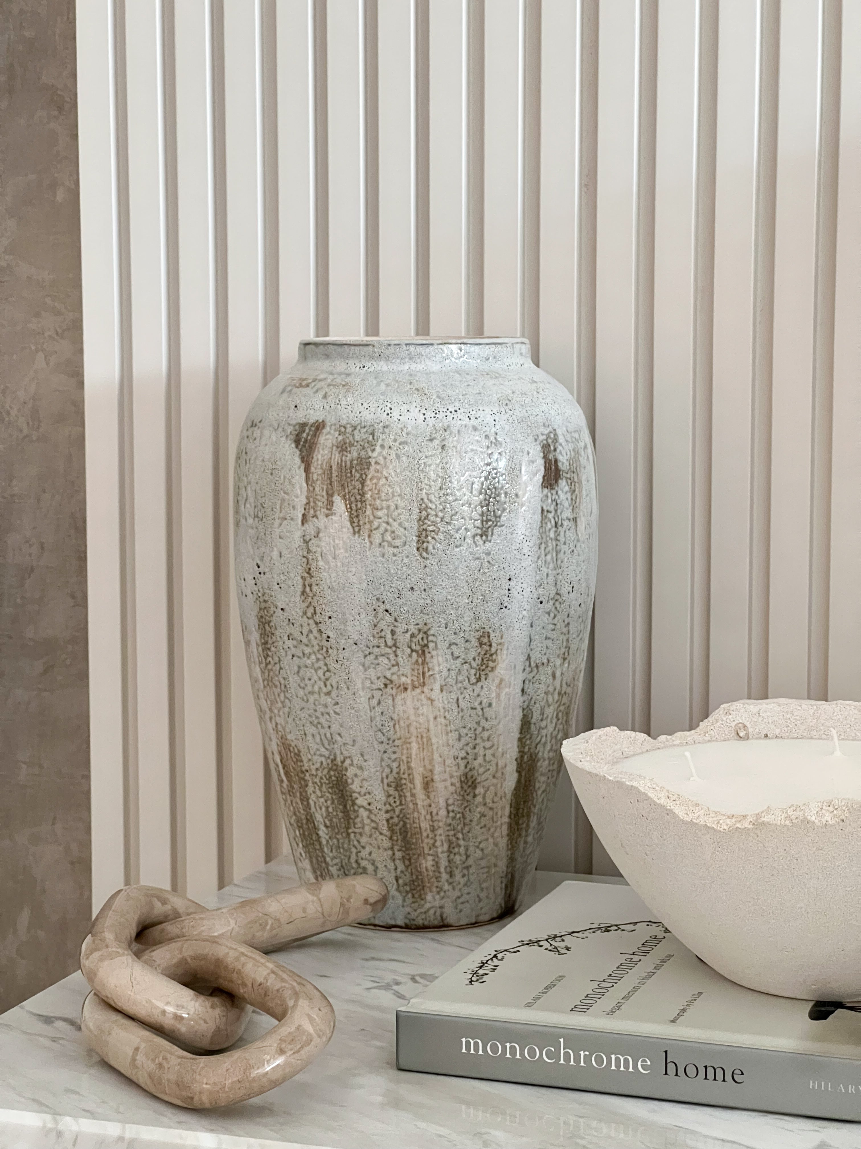 Experience refined elegance with our textured vase, a bold statement of modern luxury. With its chunky, rounded frame and rich, tactile surface, this vase features a sophisticated blend of neutral tones—soft turquoise, earthy browns, and warm neutrals. Expertly crafted to capture both strength and subtlety, it brings an effortless, sculptural quality to any space. Whether displayed as a striking centerpiece or a subtle accent, this unique design adds depth and character, perfectly embodying the perfect balance of contemporary artistry and timeless style.