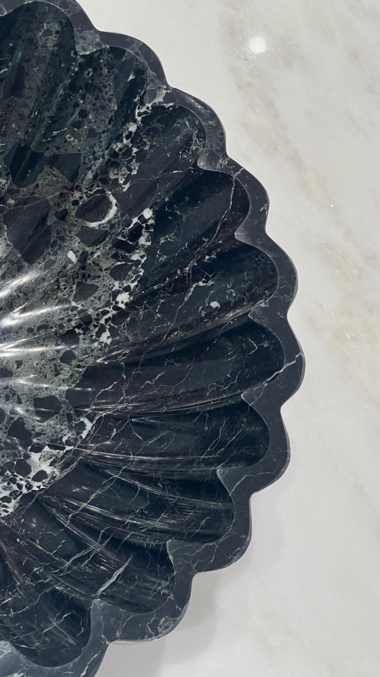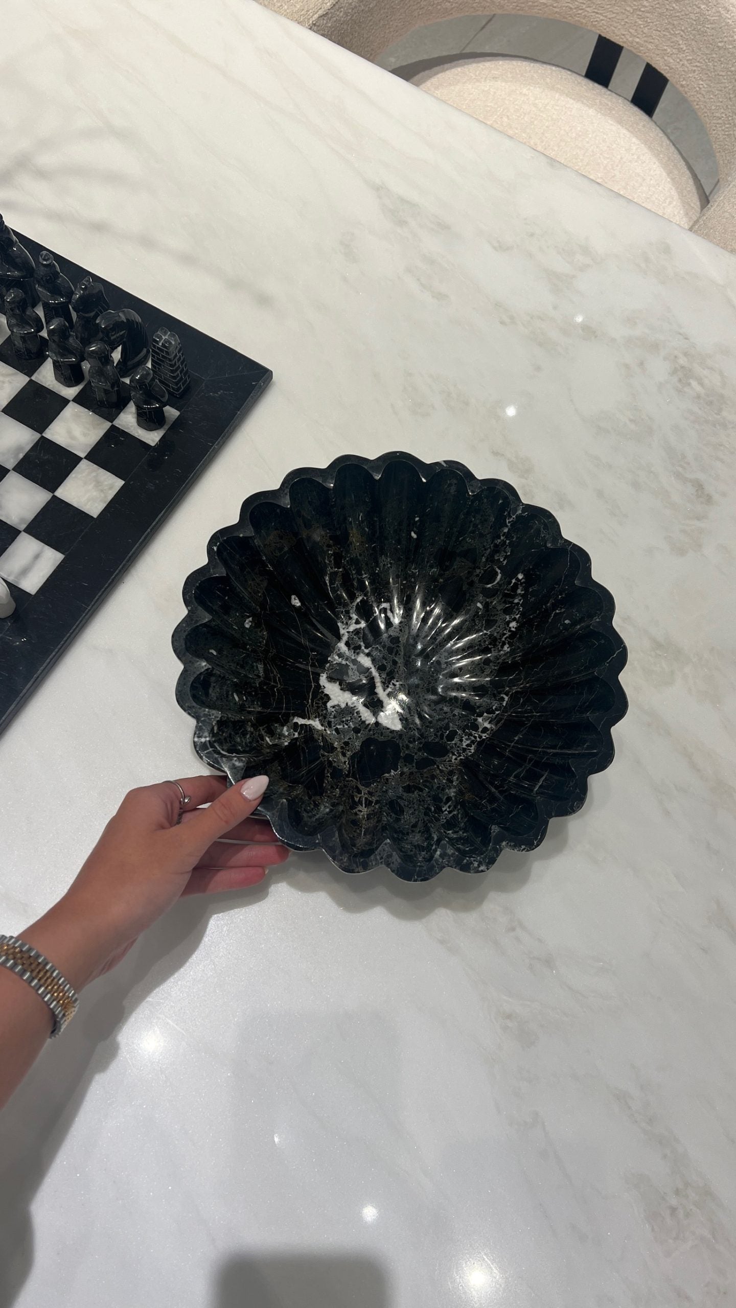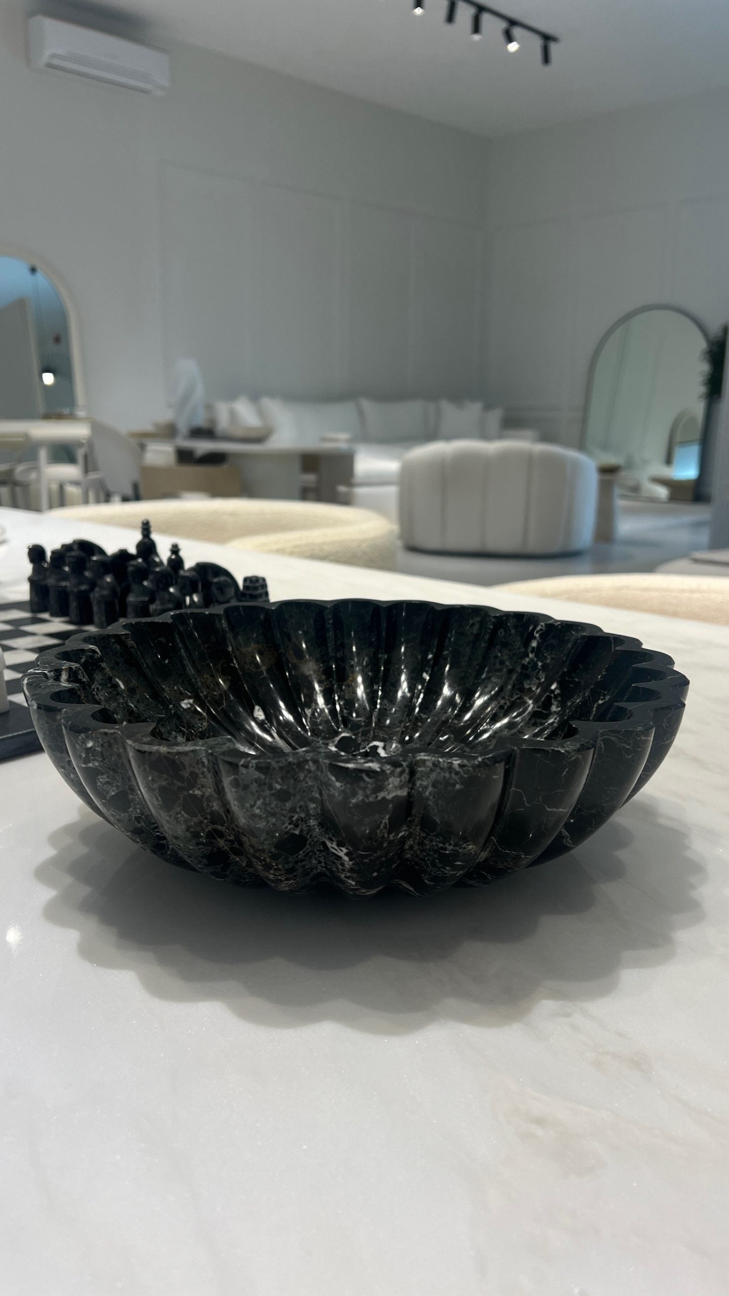 Elevate your space with our exquisite Victor Black Marble Scallop Fruit Bowl crafted from white marble, this bowl combines timeless elegance with functional design. It features wavy edges that adds a touch of sophistication but also provide a unique visual appeal that complements any setting.