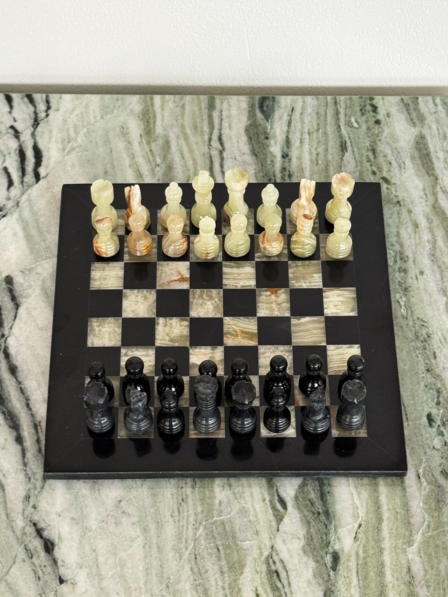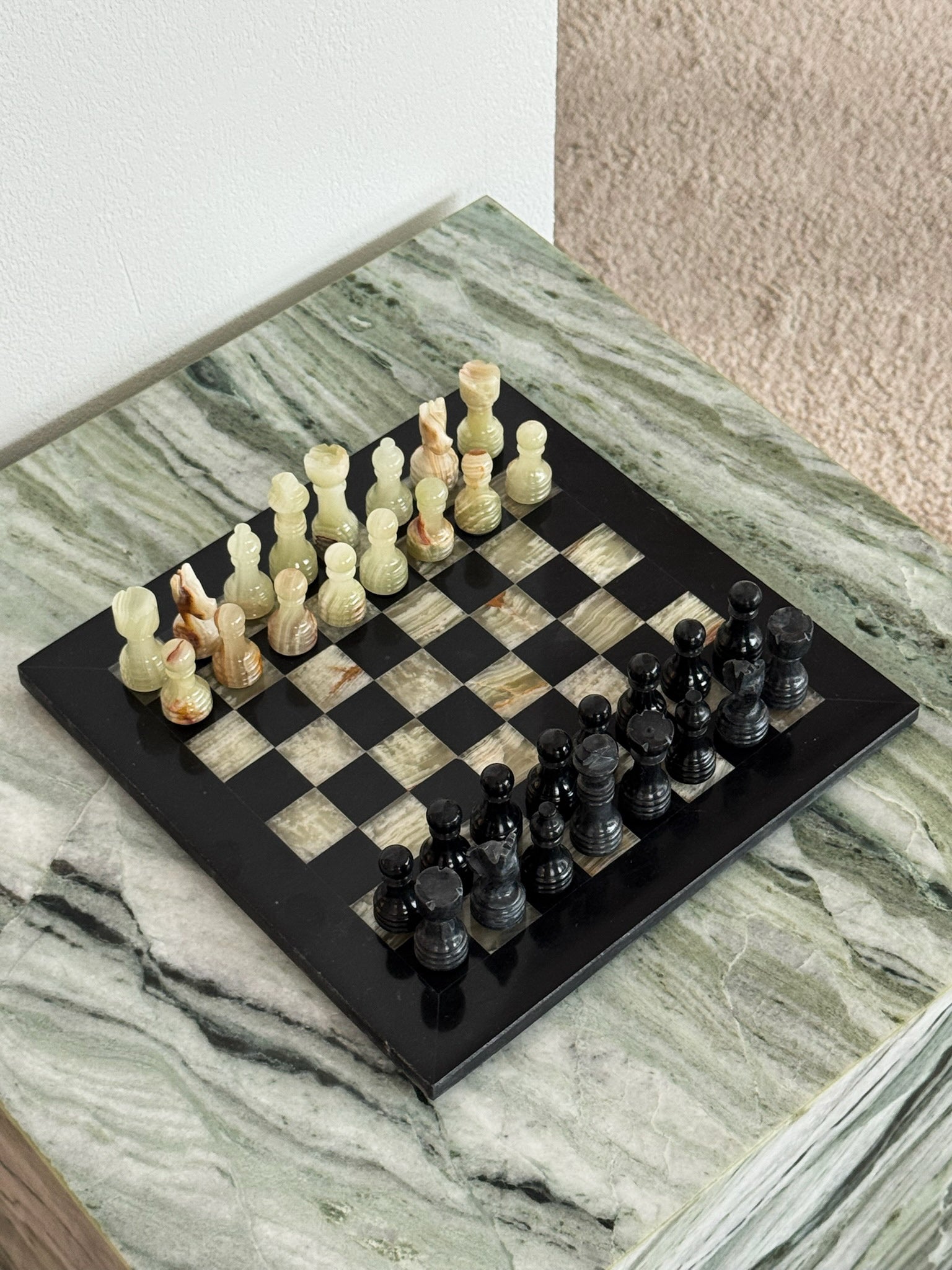 Elevate your interior with the timeless sophistication of our handcrafted Marble Chessboard Set. Carved from exquisite natural marble, this set features a striking contrast between deep black and creamy jade-green pieces, each uniquely veined by nature, no two alike. The polished board blends glossy black tiles with translucent stone squares, offering a luxurious playing surface that doubles as a refined statement piece. Perfectly suited for display on coffee tables or consoles, this chessboard brings the art of strategy into harmony with sculptural decor. A gift of intellect, artistry, and enduring style.