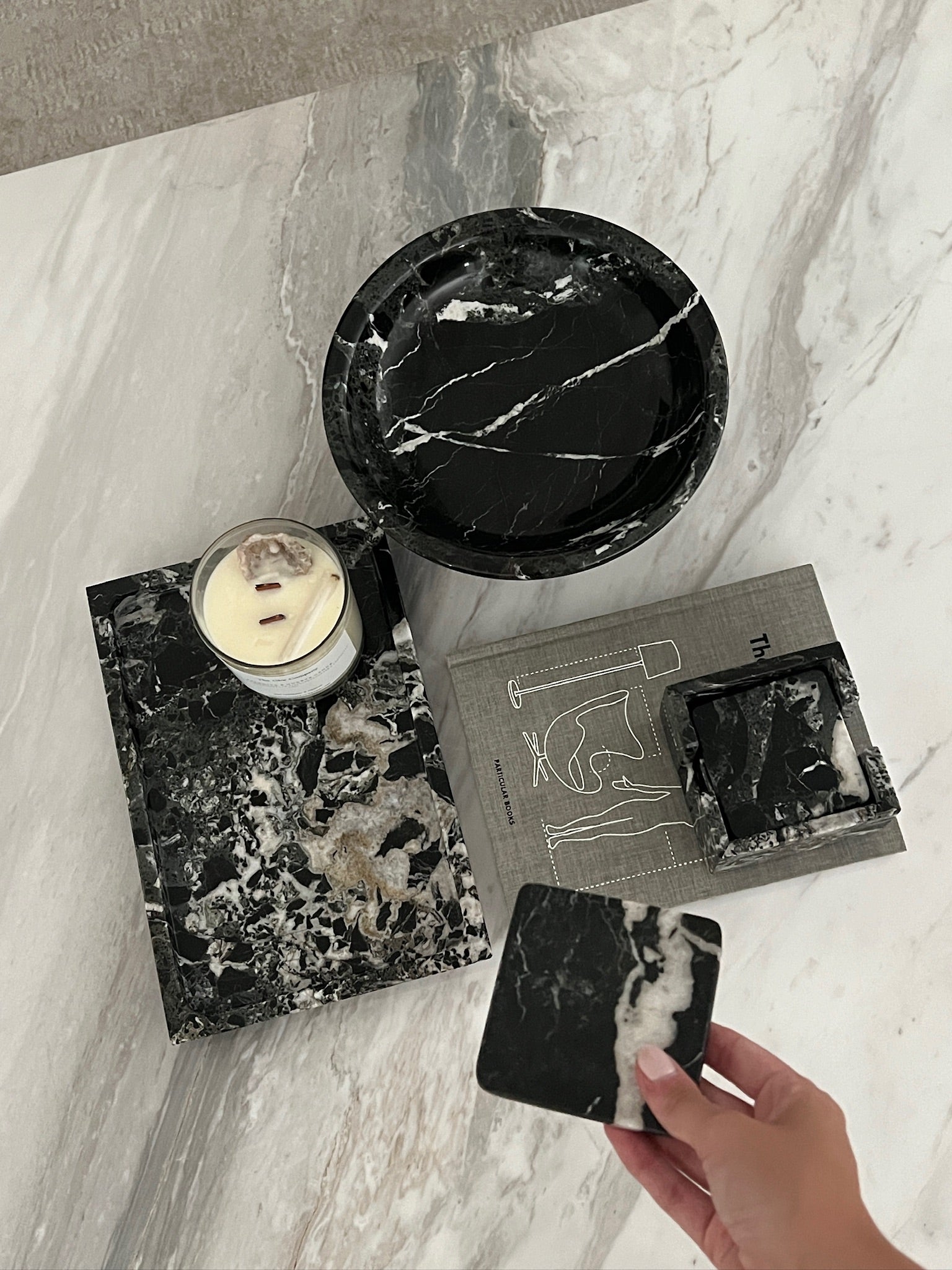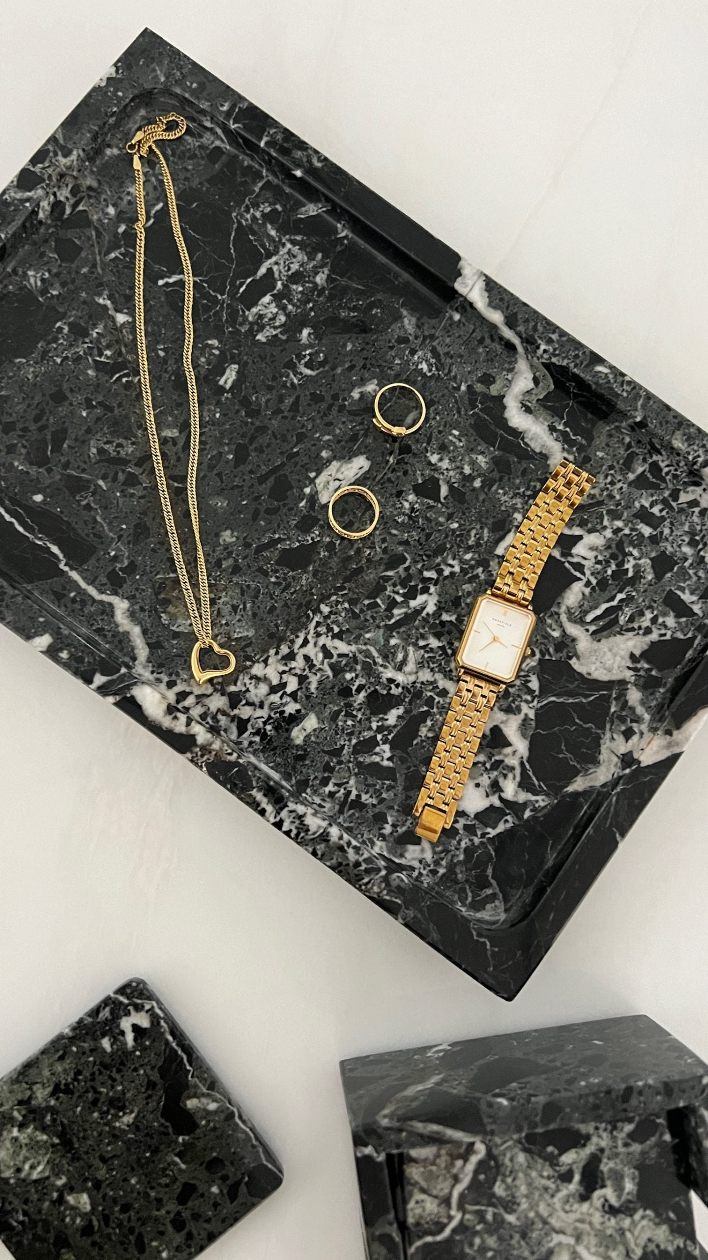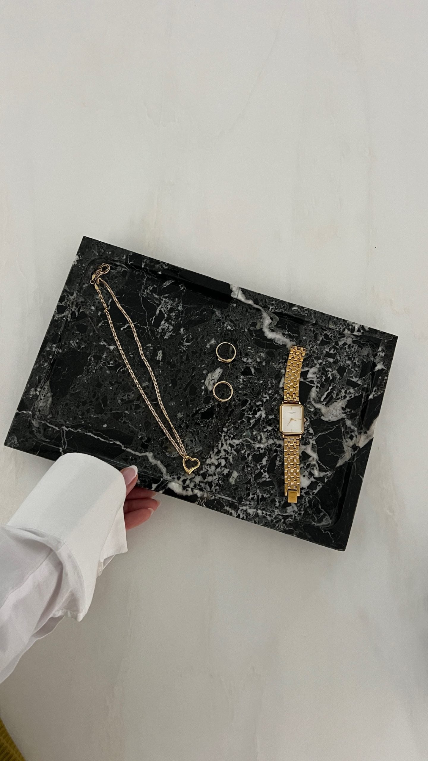Introducing the sophisticated Victor Rectangle Black Marble Tray, a luxurious accessory that combines elegance and utility. This stunning tray is designed to organize and display your precious items with style and sophistication.