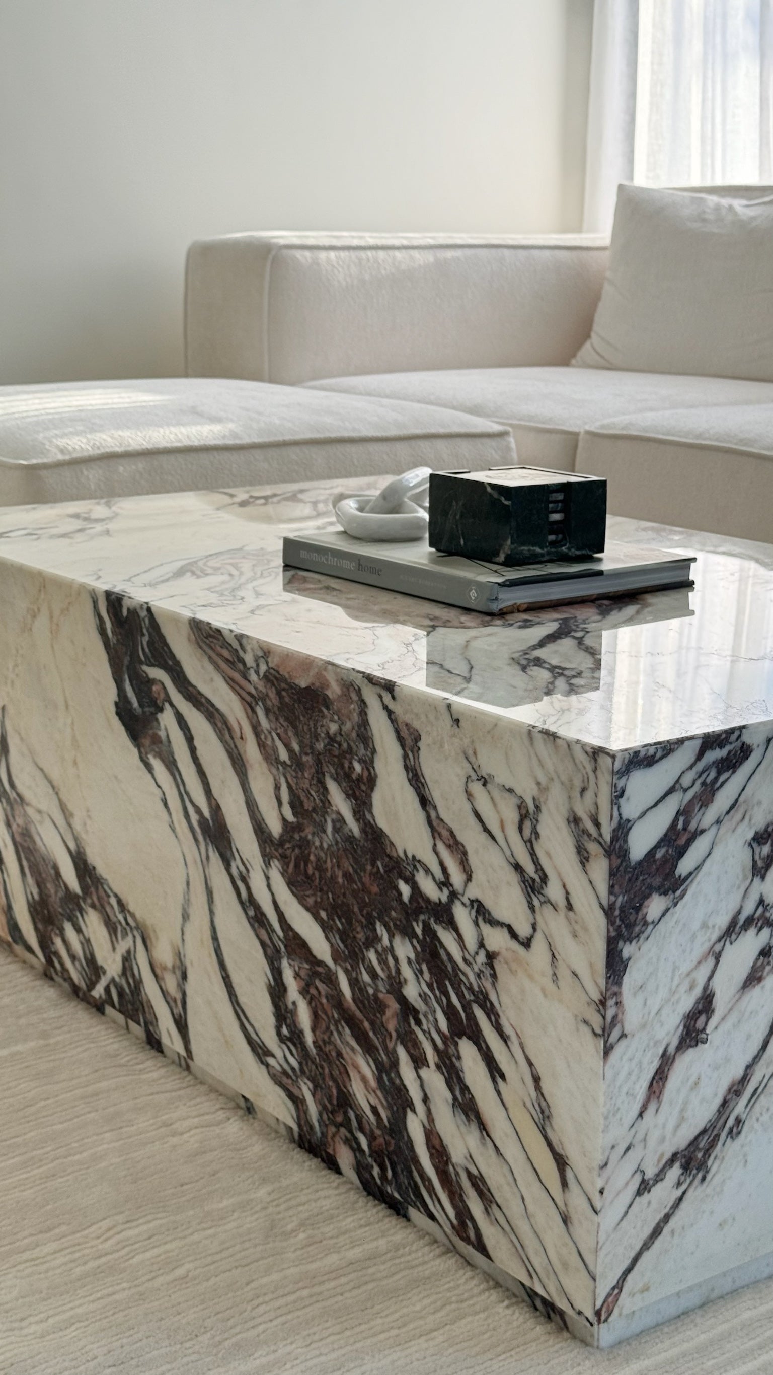 The Violet Marble Coffee Table brings the timeless elegance of Calacatta Viola marble into a compact and functional form. Known for its striking veining and luxurious appeal, the solid marble top serves as a stunning focal point in any living space. Each table is unique, with intricate veining that adds depth and sophistication, while its polished finish enhances the natural beauty of the marble.
