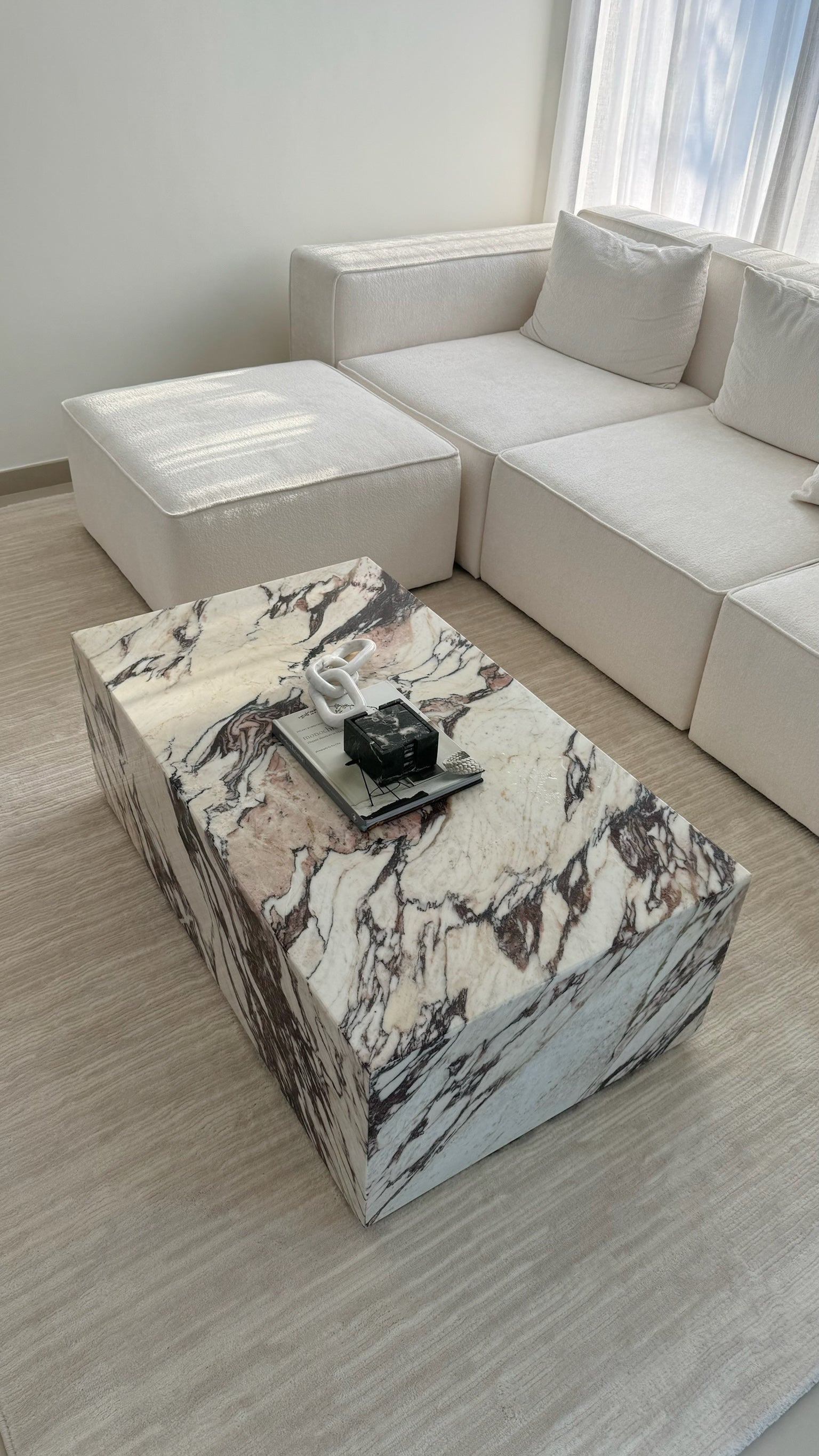 Supported by two sculpted solid marble legs, the table combines both strength and style. The seamless design of the legs complements the unique veining of the top, creating a harmonious and refined aesthetic. Ideal for those who appreciate high-end craftsmanship and timeless design, the Violet Marble Coffee Table is a statement piece that will elevate the ambiance of any modern or traditional interior.