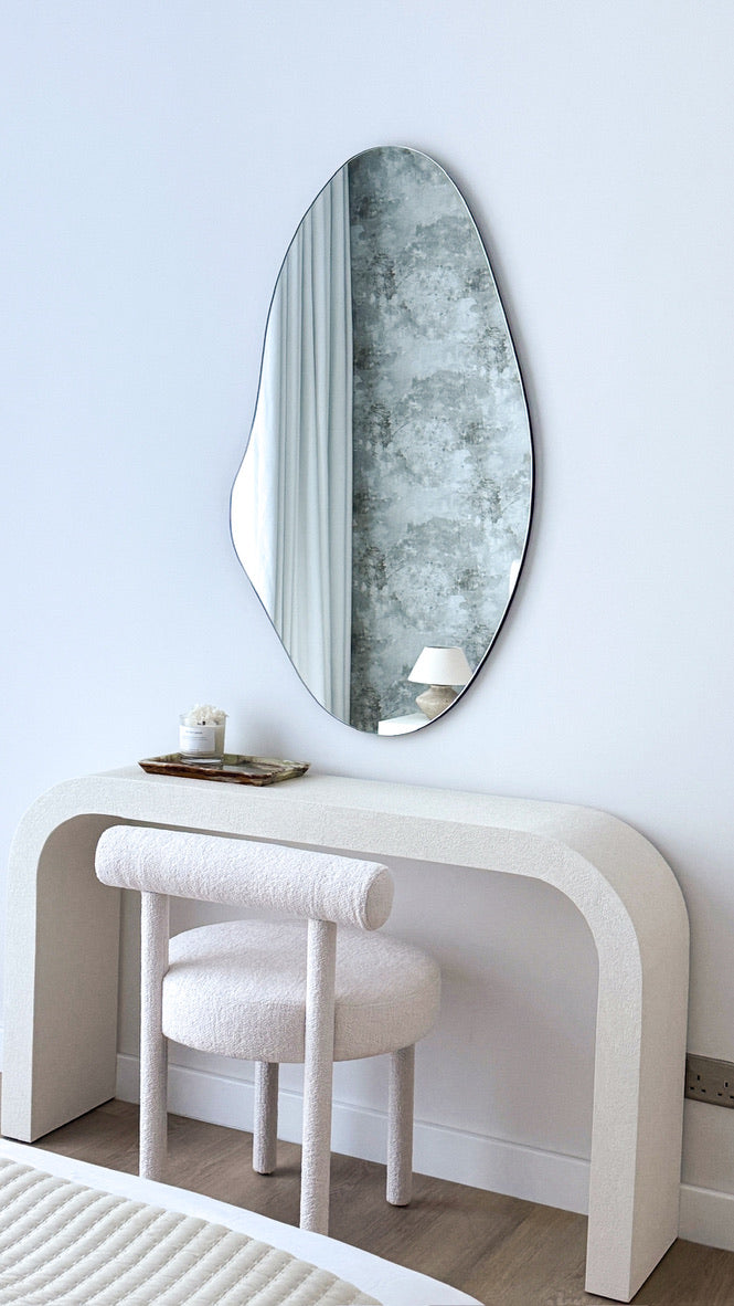 The Vivienne Curve Console Table, made from white textured painted wood. This console makes a great addition to any hallway or entry space in your home. Pair with one of our mirrors for a luxury living look.