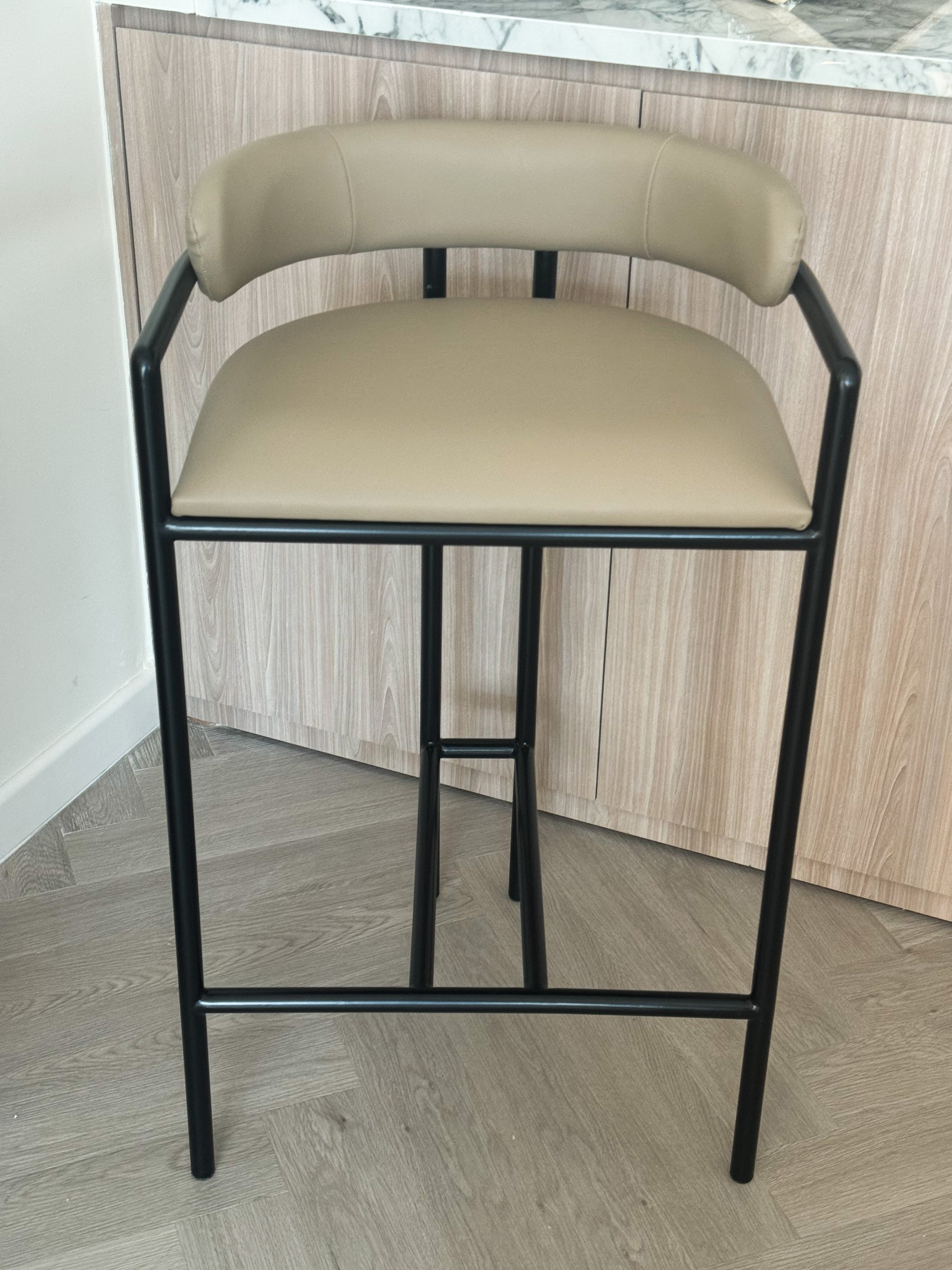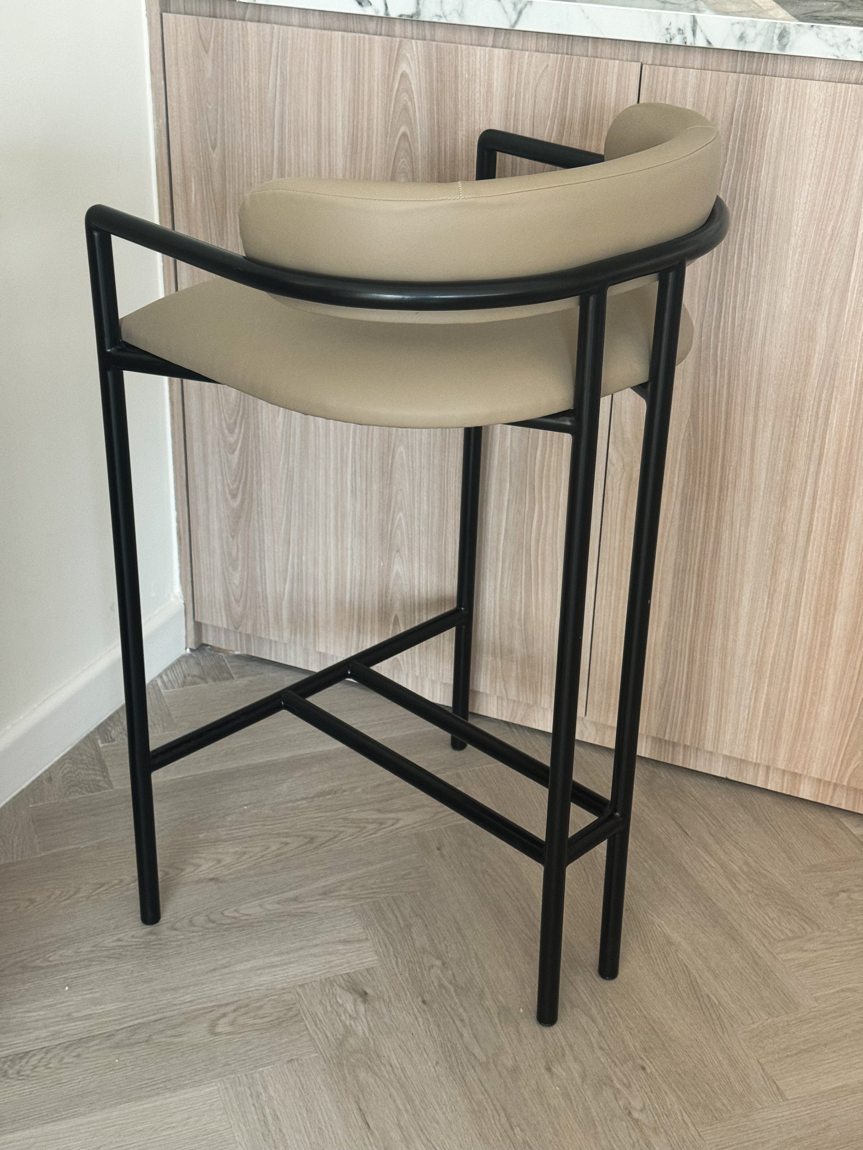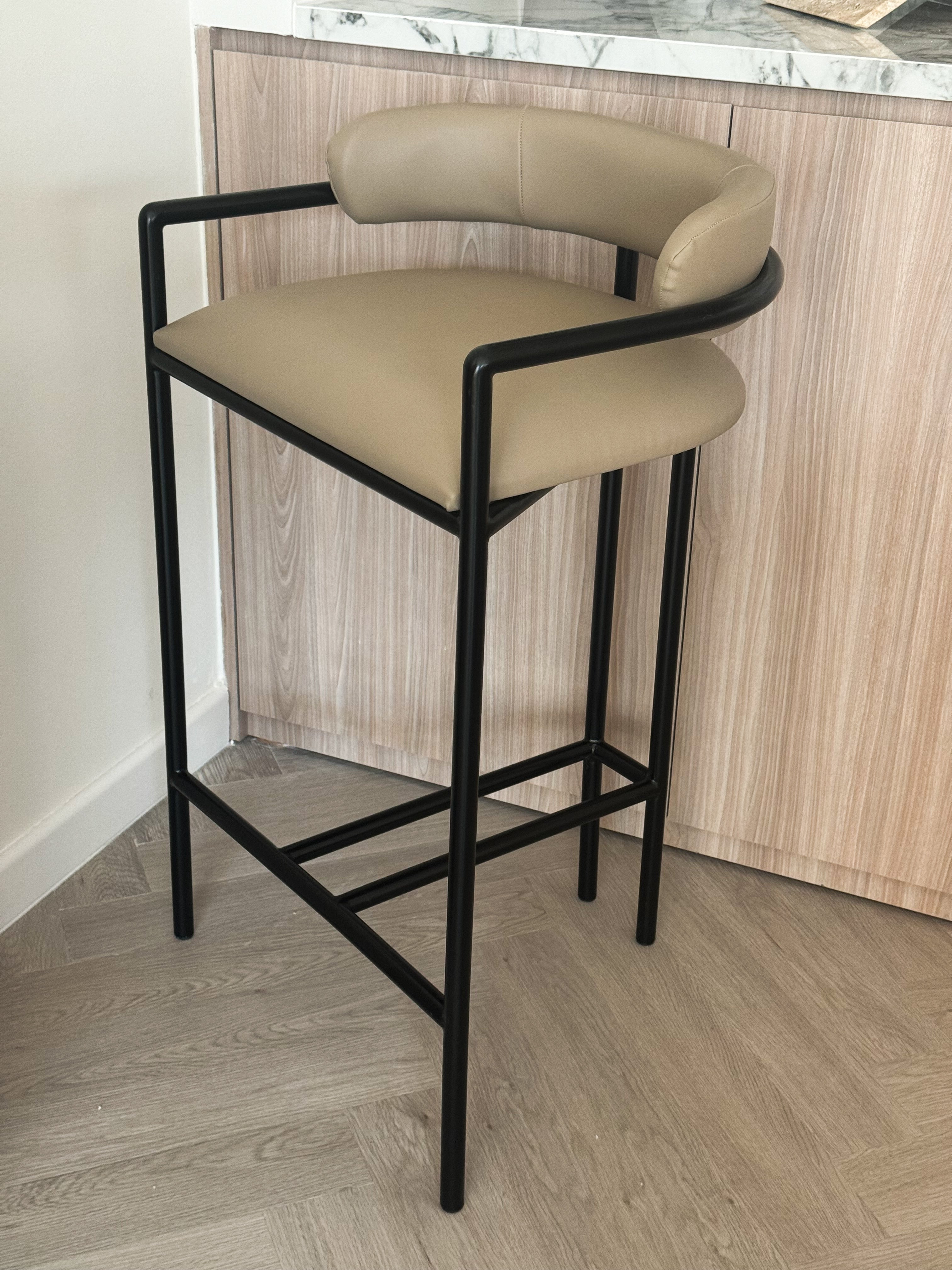 The Walter Bar Stool features a sleek mocha-coloured leather-look seat and sturdy black metal legs, combining modern design with comfort. Its minimalist aesthetic makes it a versatile addition to kitchens, home bars, or dining areas.