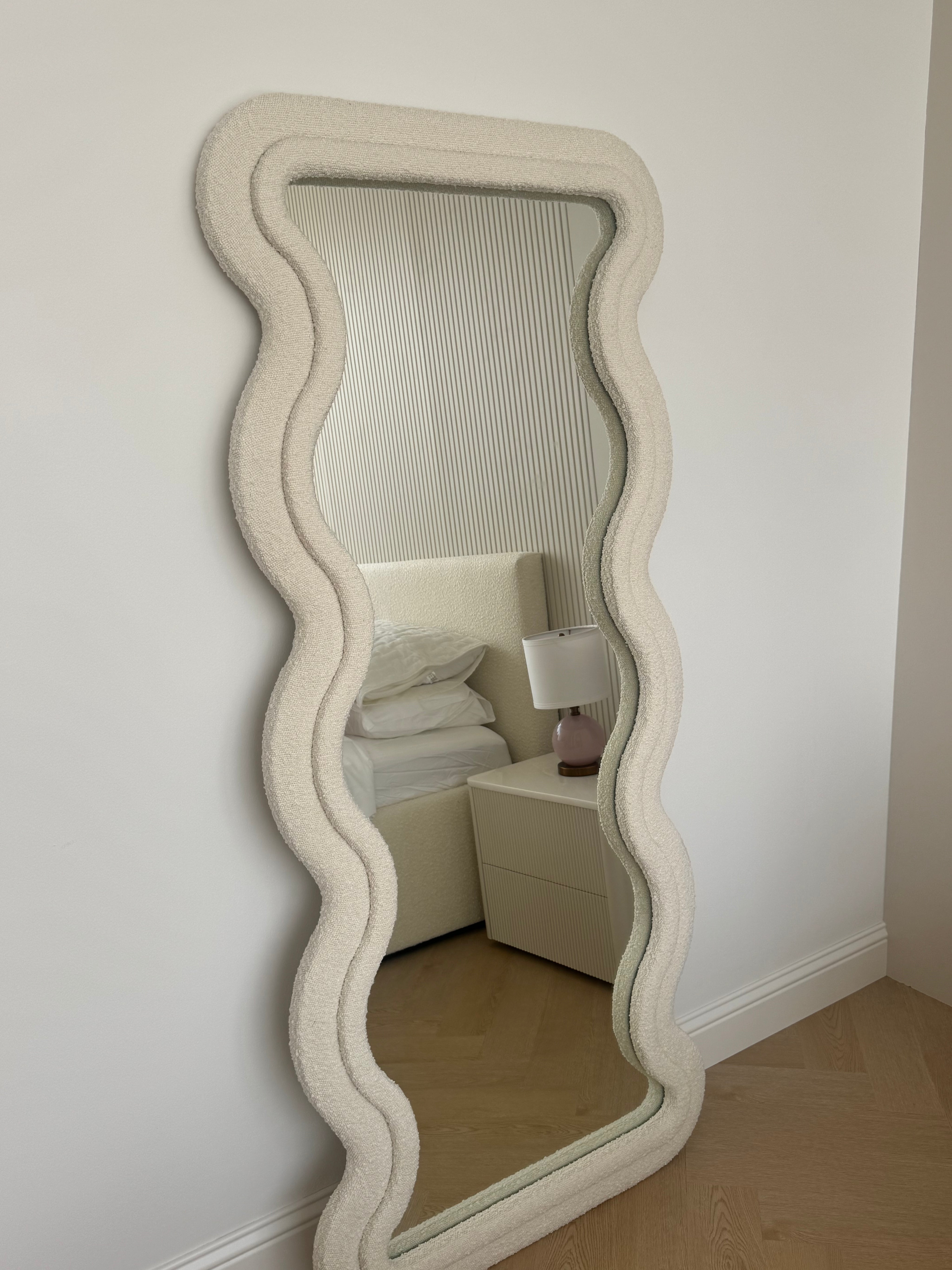The Wave Boucle Mirror is a statement piece in itself that adds a cozy and luxurious feel to any space. It creates a visually captivating contrast between the softness of the fabric and the fluidity of the mirror's shape. Its wave design adds a sense of movement and dynamism, making it a striking decorative element that can enhance the overall ambiance of a space.