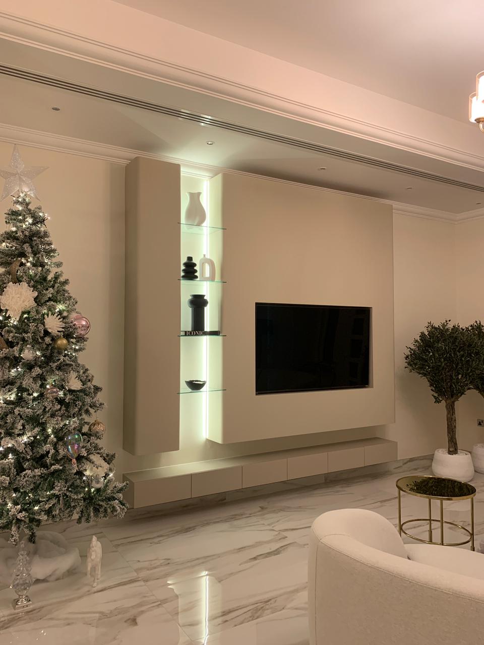 The Willow Media Wall sleek, seamless look features a curved edge unit where the TV is integrated into the wall, sitting flush with the surrounding surface with glass shelvings and a floating cabinet that maximizes both storage and aesthetic appeal giving a clean and sophisticated appearance. Glass shelves provide a light and airy feel, making the room appear more spacious.
