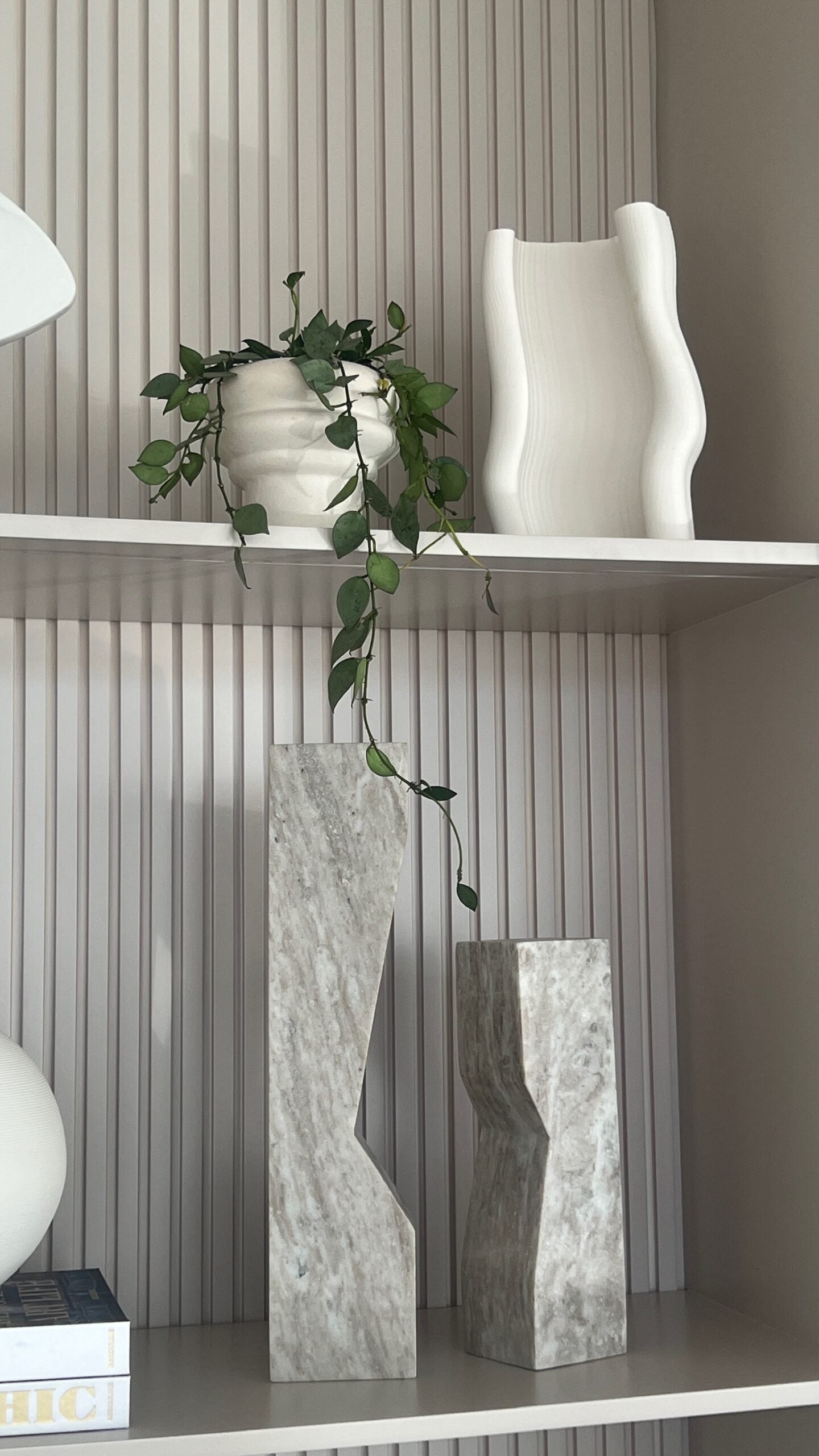 The Wren Arch Shelving Wall creates a visually striking and elegant storage solution that adds architectural interest to any room. The back panel of the shelving unit is adorned with evenly spaced vertical groove fluted design that run along the surface. This fluted back panel adds texture and depth to the shelving unit, creating a visually dynamic backdrop for displaying items.