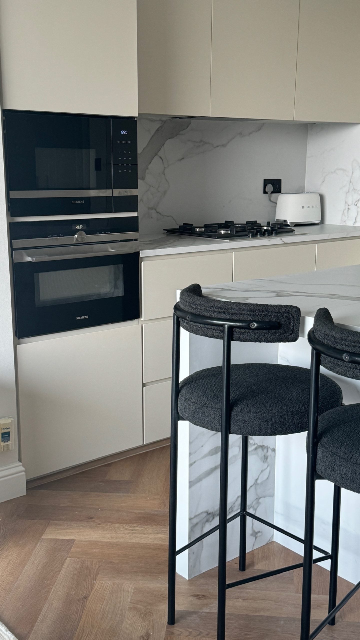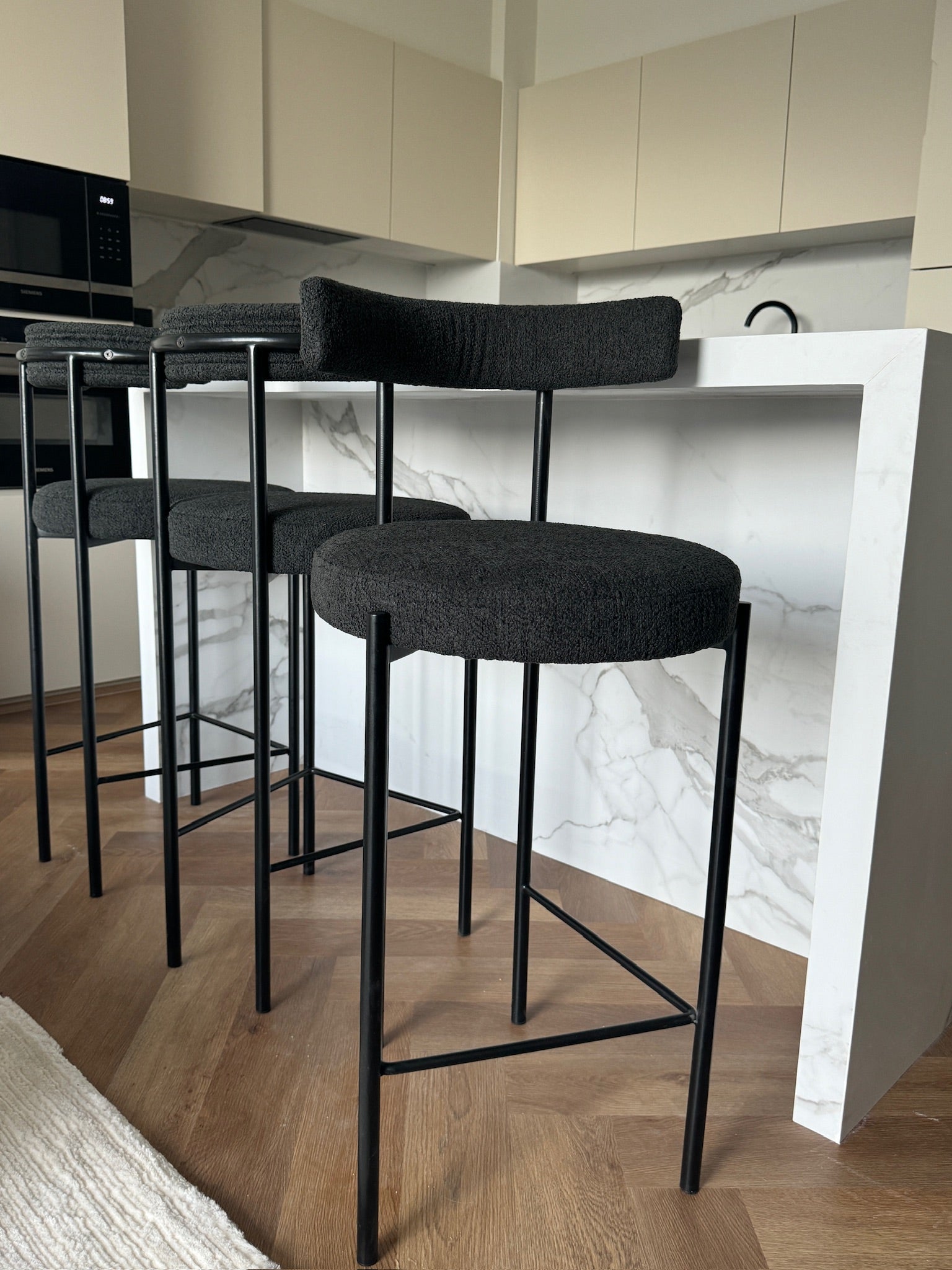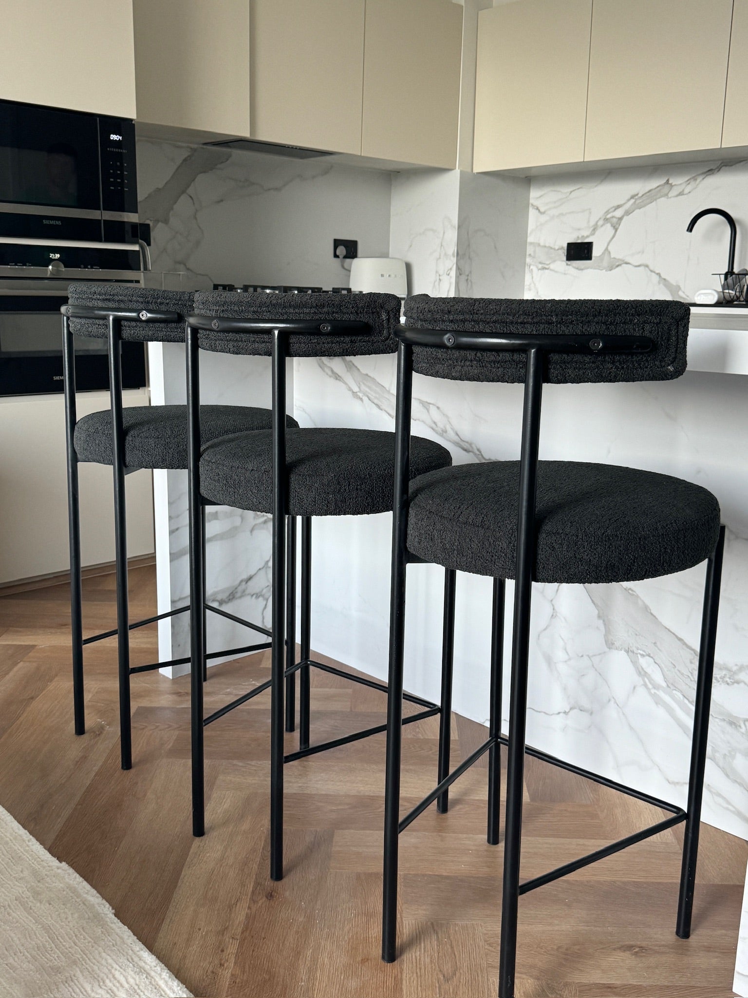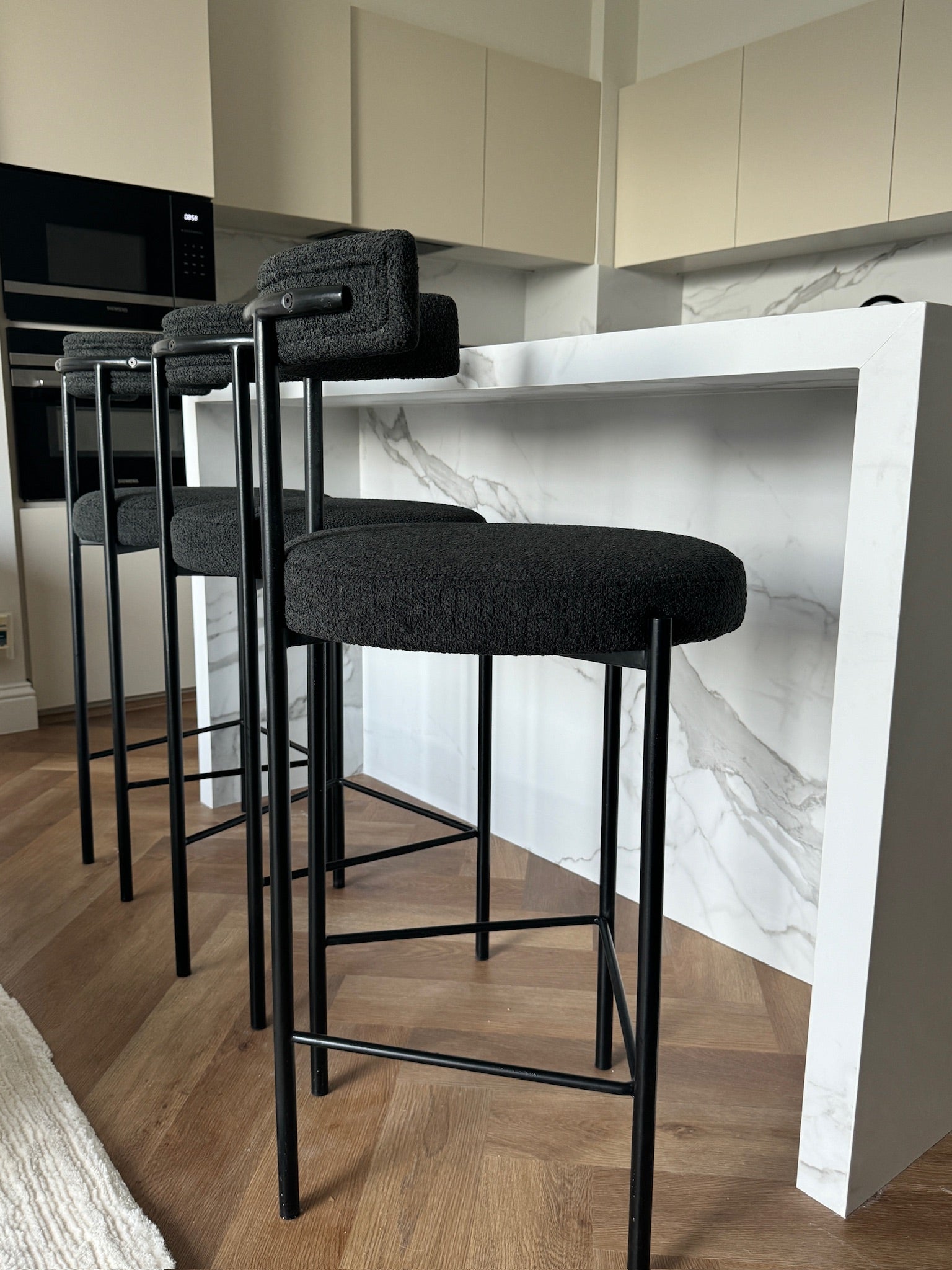 The Zander Black Boucle Bar Stool is the epitome of comfort and style for your kitchen island or bar area. It seamlessly blends luxurious texture with modern flair, creating a chic focal point with its soft and inviting texture of bouclé fabric. The sleek, slender legs feature a matte black finish, adding a modern contrast to the plush bouclé upholstery.