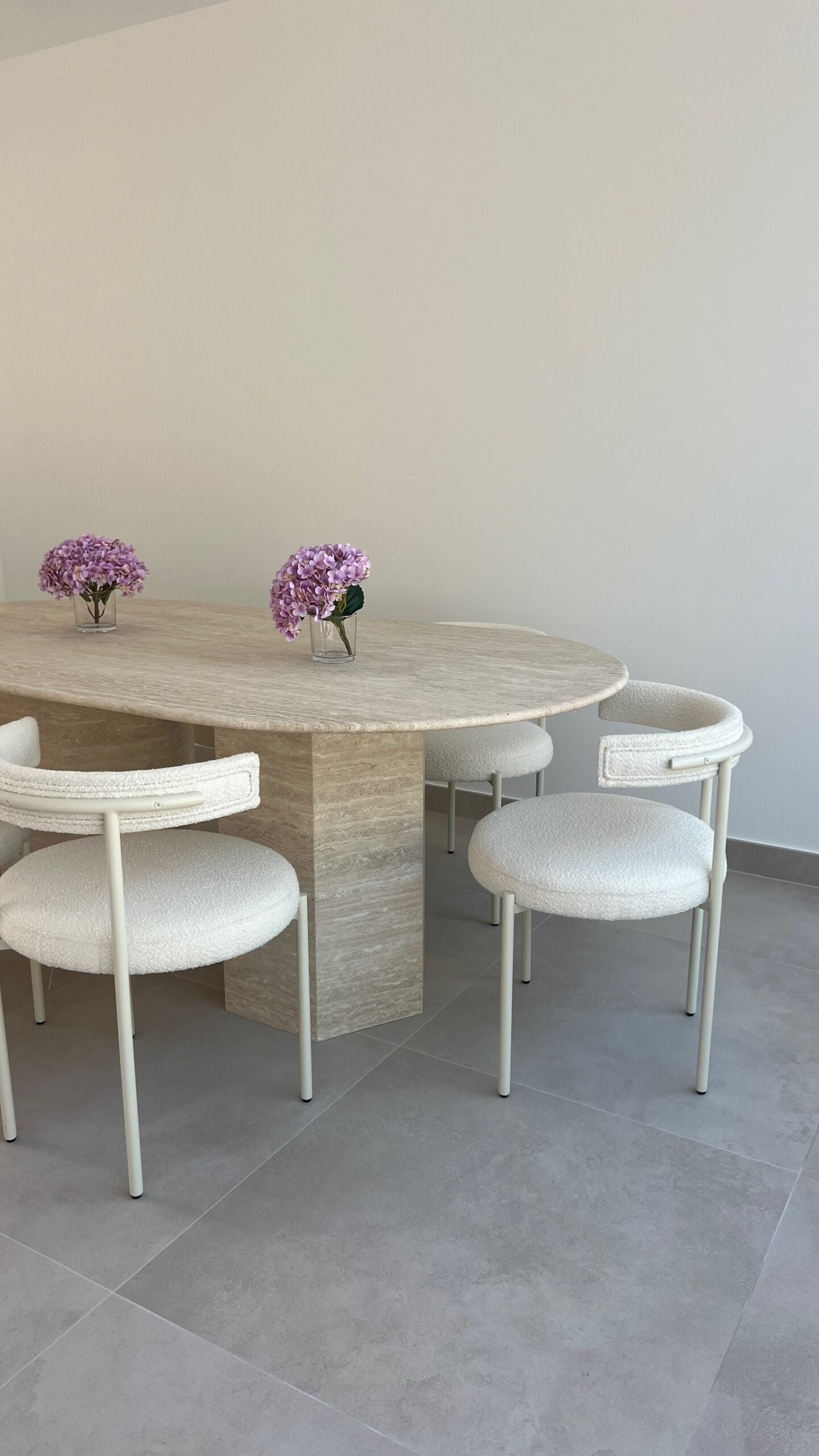 This contemporary design and high quality boucle fabric chair is our go to for chic modern day dining and we are obsessed