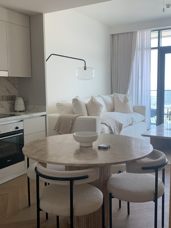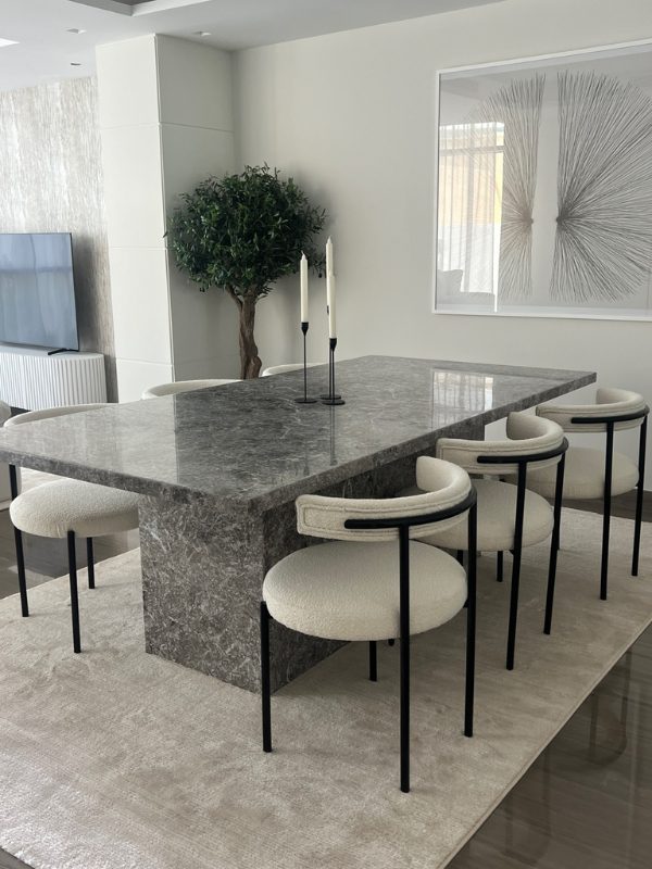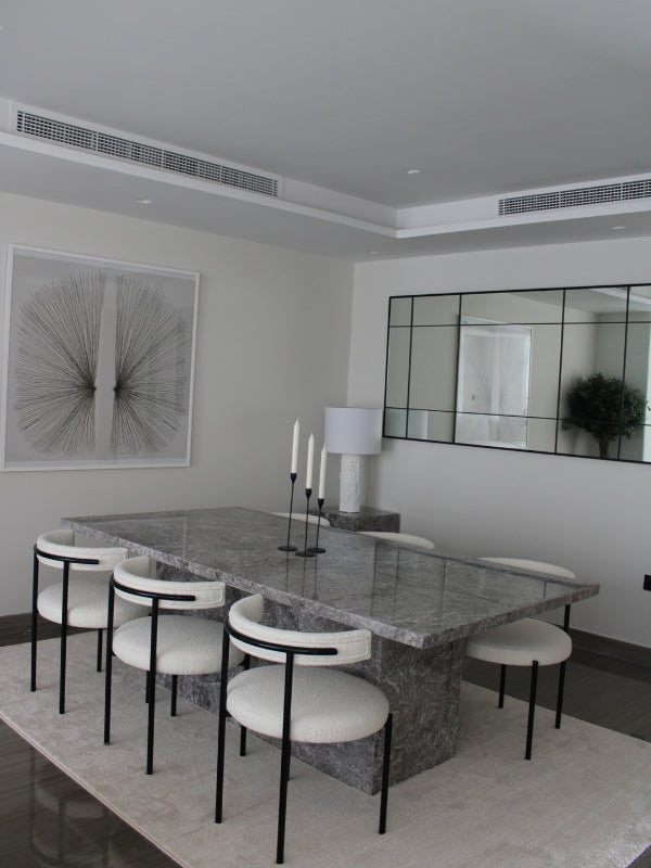 Zander boucle & matte black steel dining chair. This contemporary design and high quality boucle fabric chair is our go to for chic modern day dining and we are obsessed.
