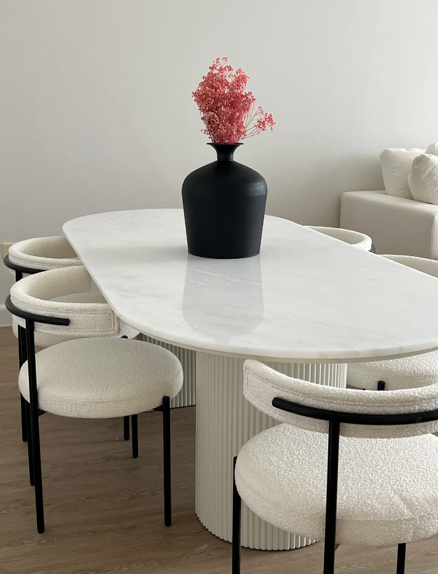 Zander boucle & matte black steel dining chair. This contemporary design and high quality boucle fabric chair is our go to for chic modern day dining and we are obsessed.